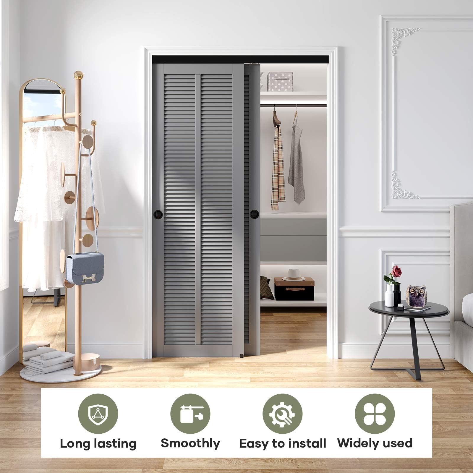 is a company specializing in barn door products.We have advanced production technology and an excellent after-sales service team.We are committed to providing customers with better products and service. [ Commercial Grade ] High precision aluminum box bypass track for double pocket door,concealed sliding ensures beauty and durable.Track can be cut into any length to meet your own require. [ Soft Like Butter ] Ball bearing three wheel roller slide smoothly and quietly,tested beyond 100,000 rolls.The quick-release locking tab makes it easy to install or remove the door without the need to run the door panel off the rail. [ Reminds ] Fit double 25" wide door,note door need 1" overlap;Fit door thickness 1-3/8" or 1-3/4"(35mm/45mm);Each door weight capacity: 150lbs. Package Includes:(1)4ft rail,(4)rollers,(1)door Stops,(1)floor guide,(2)finger pull. DOOR NOT INCLUDED [ Easy Install ] We provide step-by-step graphic & text installation parsing manual,you can also get soft online copy and professional installation guide from our online service.All items have been multiple inspected before on market. [ 24 Hours Stand By ] specialize in sliding door and hardware many years,if there anything missed or broken,pls let us know,we are whole day online to solve your problem.