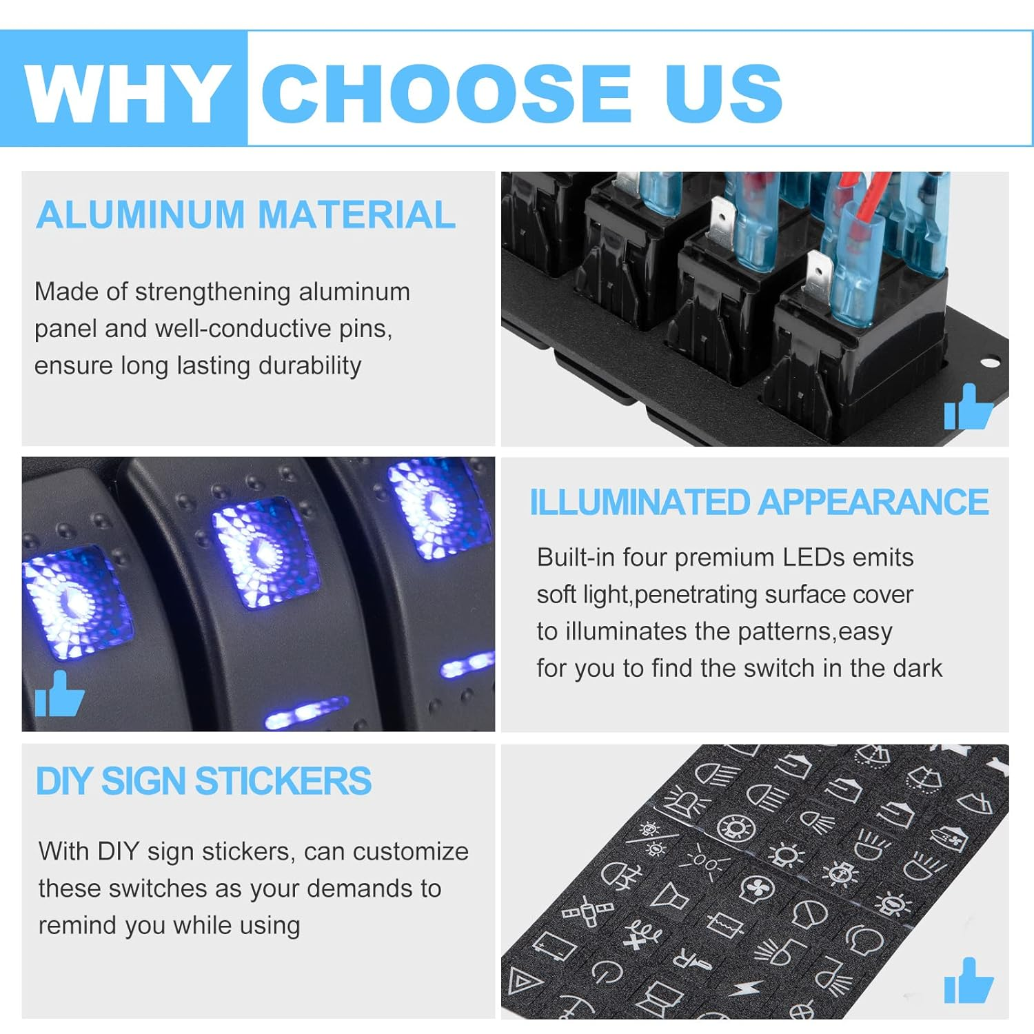 BETTER CONTROL DIFFERENT ACCESSORIES: 4 gang switch panels are perfect for controlling LED light pods,fog lights,headlights,taillights and auxiliary lamps,etc.Come with DIY sticker, you can define the name and assign switches according to your needs BLUE LED LIGHT DESIGN: Built-in four premium LEDs emits soft light,penetrating surface cover to illuminates the patterns,easy for you to find the switch in the dark SUPERIOR DESIGN: Durable aluminum panel and well-conductive 5 pins,effective waterproof and dustproof,ensure long lasting durability WIDE APPLICATION: With pre-wired wiring harness for you to easily install in both 12V and 24V vehicles, SUV,UTV, ship, caravan, caravan, etc PACKAGE INCLUDES: 1x 4 gang switch panel, 1x screw sets, 1 set of DIY stickers Product Description