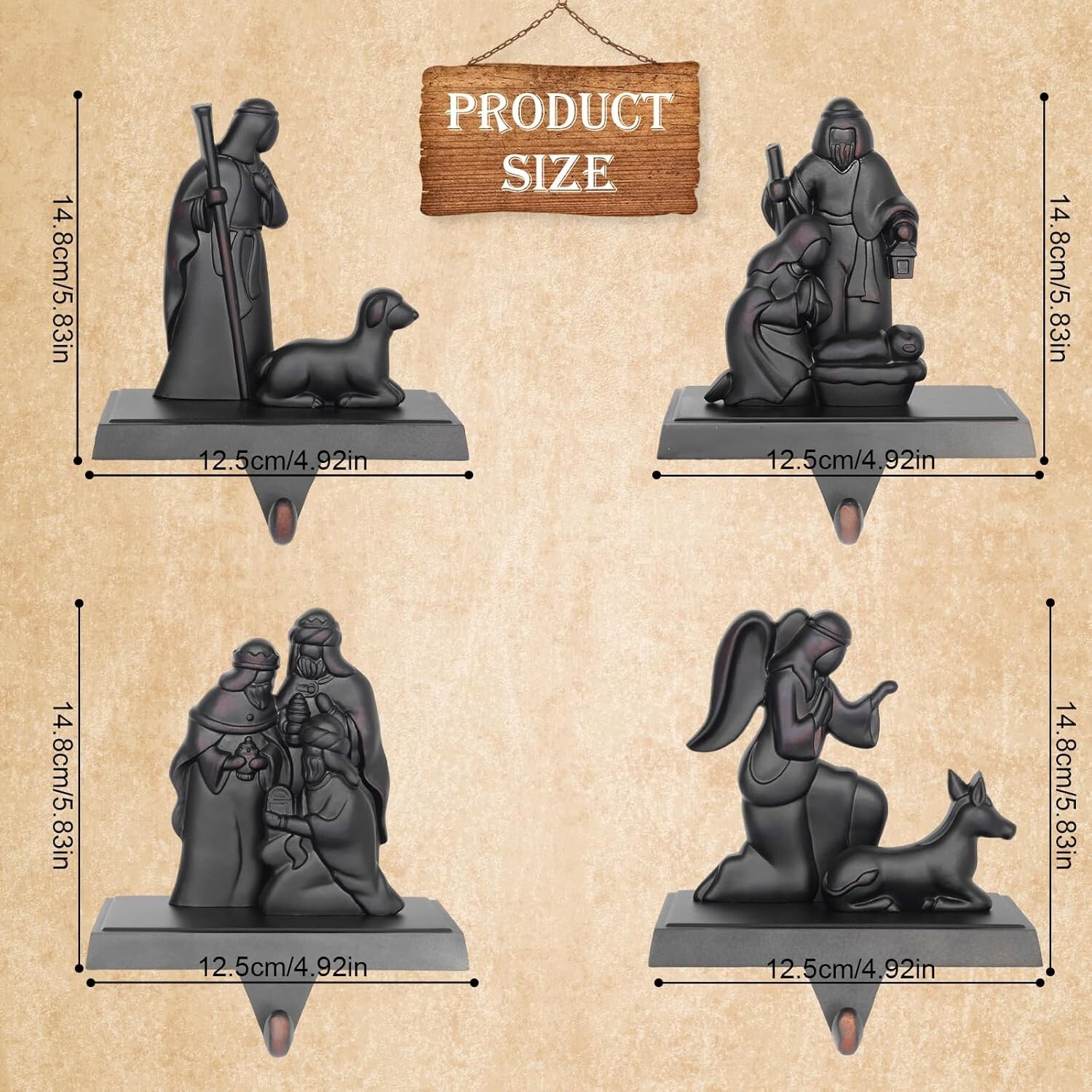 Package Includes : You will receive 4 mantel sock holders, including 4 Nativity scene ornaments, the size of the angel and the donkey is about 12.5*8.5*14cm; the size of the shepherd and the lamb is about 12.5*8.5*15cm; the size of the Virgin and Jesus is about 12.5*8.5*14.5cm; the size of the Three Kings is about 12.5*8.5*14.5cm Christmas Sock Holder : The bronze Nativity mantel is more unique and retro, and the bottom of the Christmas sock holder is covered with soft and non-slip material, which makes it not easy to slide, while protecting your desktop from scratches. With thickened hooks, you can fill more gifts in the Christmas stockings Metal Sock Holder : The Christmas sock holder is made of high-quality metal, which is durable and has a long service life. Decorating the Nativity theme mantel sock holder at home will bring you and your family more beautiful Christmas memories Christmas Decoration : Decorating the weighted mantel sock holder on the mantel, table, windowsill and shelf will bring you a richer Christmas atmosphere. Decorating Christmas stocking hangers at home will bring more different and wonderful memories to you and your family