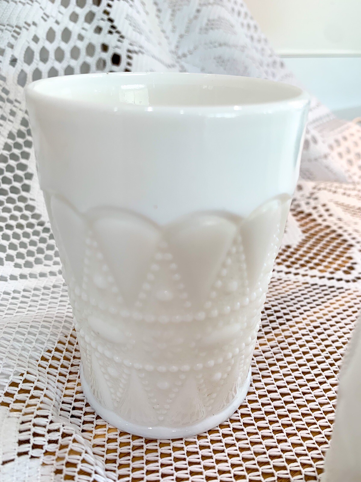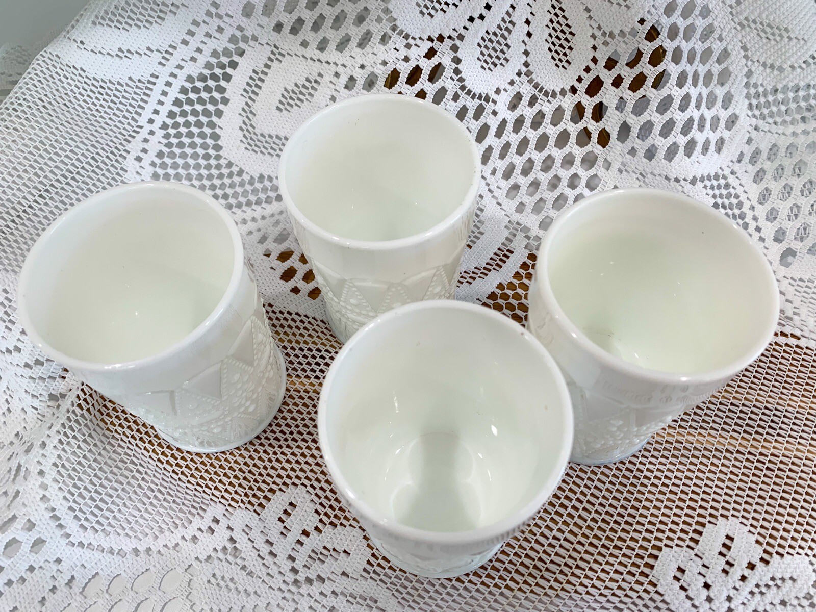 * Set of 4 Kemple lace and dewdrop milk glass juice glasses/tumblers. This vintage set of 6 ounce each flat tumblers was produced by Kemple Glass in the dreamy lace and dewdrop pattern. An awesome set of 4 milk glass tumblers measuring approximately 4" tall. CONDITION: * Beautiful Excellent Condition, no chips or cracks If you get a chance, check out other listings in our store. Visit our CW SPORTS AND NOVELTIES Store (profile: plentyostuff) for more great items waiting for you. You might find that treasure you have been looking for. We happily answer questions and you are free to make offers. We are glad to combine shipping on multiple purchases too! Thank you for shopping with us!