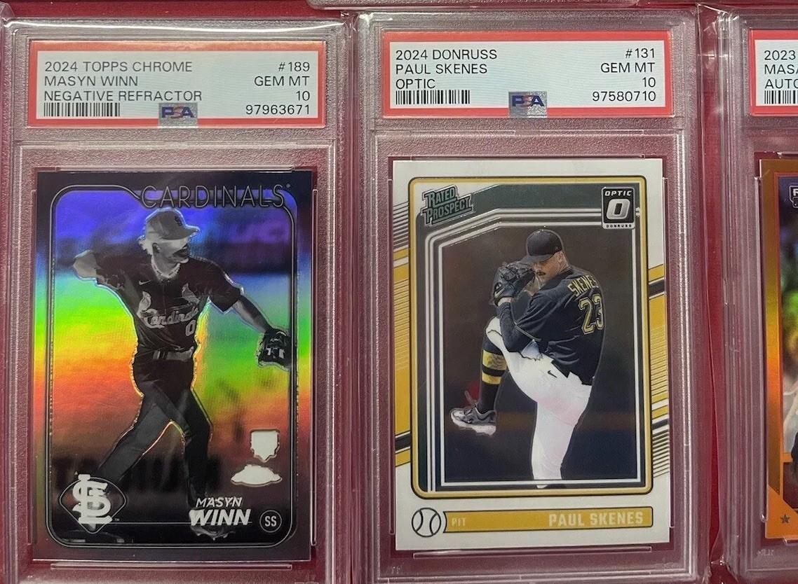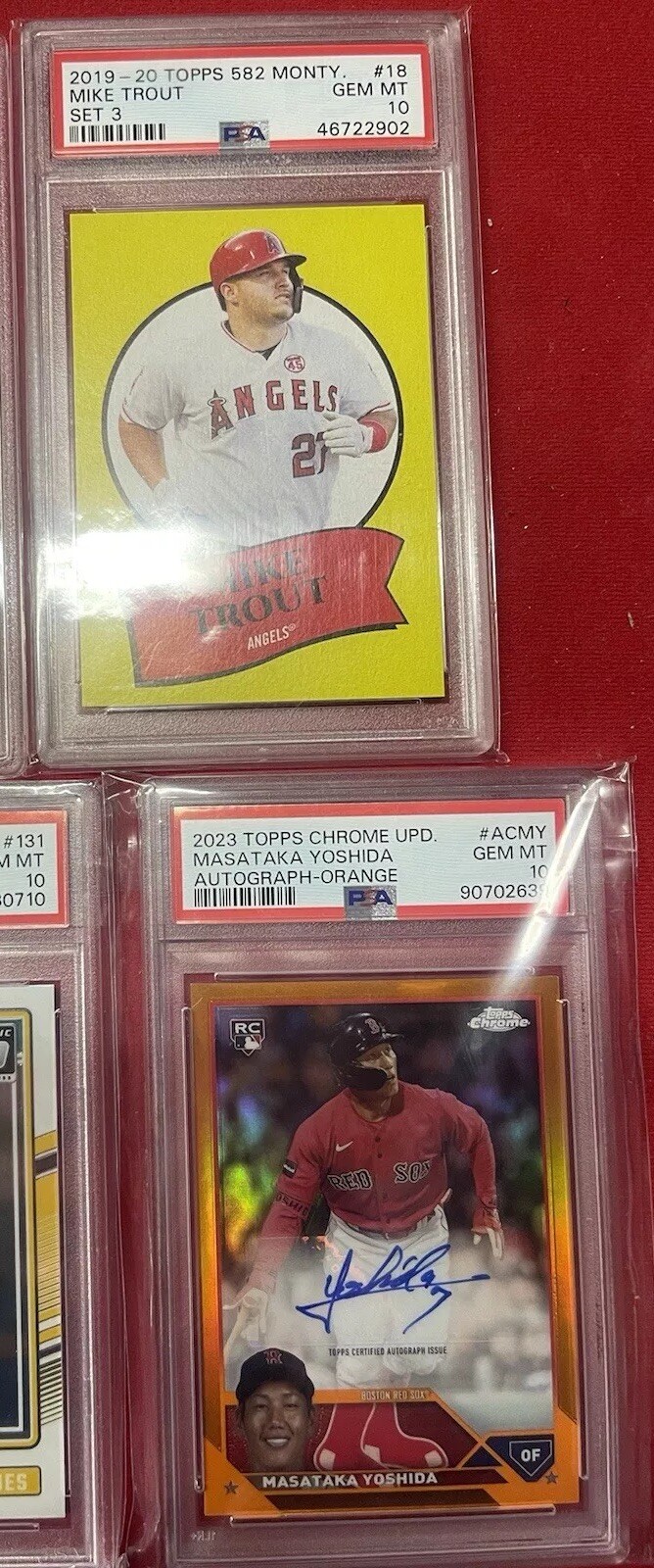 Elevate your baseball card collection with this exceptional lot of 10 MLB cards, each graded PSA 10 GEM MT. This carefully curated selection features prominent players such as Mike Trout, Fernando Tatís Jr., Juan Soto, Yoan Moncada, and more, ensuring a high-caliber addition to your sports memorabilia. Autographs are a highlight, with hard-signed autographs from top athletes included in the lot. The cards boast an array of sought-after features like inserts, parallels, rookies, and short prints, some with exclusive stickers and serial numbering. Whether you're a seasoned collector or new to the hobby, this Topps-manufactured set is a treasure trove for fans of the game.