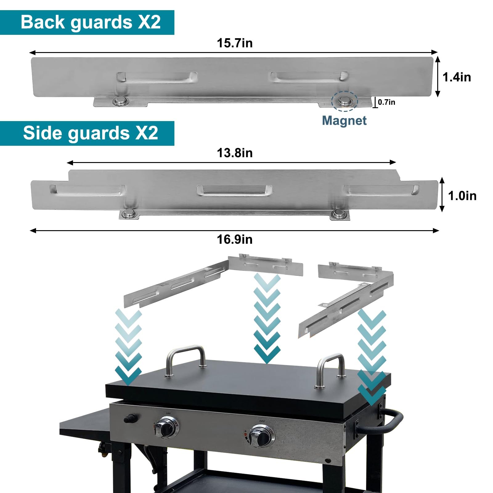 Wind Guard for Blackstone Griddle 1. Easy Installation and Portability: Our Magnetic Blackstone griddle accessories can be installed on your Blackstone griddle in seconds and removed just as easily. Their compact shape and lightweight design make them easy to carry, too. 2. Efficient Heat Retention: With these grill accessories, outdoor cooking is made easy and efficient. Maximizing the flame and concentrating the heat, they shorten cooking time while saving propane. 3. High-Quality Materials: Made with durable high-temperature resistant magnets that can withstand temperatures of up to 660°F. The wind guards are constructed from 430 stainless steel that is corrosion-resistant, oxidation-resistant, and easy to clean. The black coating adds the perfect finishing touch to match your Blackstone griddle. 4. Wide Compatibility: Our wind guards are compatible with a range of 36-inch Blackstone griddles including models 1554/1565/1818/1820/1836/1841/1863/1866/1868/1899/1923/1984/2006/2102/2122/2149/2151. They are also suitable for use with rear grease cup, side shelf, hood, and cover, but not with the Culinary Series. 5. Perfectly Match Your Griddle: Cover the gaps between your Blackstone griddle top and the burners with our wind guards for a perfect fit. The side guards measure 16.9'' x 1.4'', and the back guards measure 15.7'' x 1.4''. Plus, you can leave them attached to your grill during transport. 6. A Must-Have Accessory: Our wind guards are an essential accessory for any Blackstone griddle enthusiast. Not only do they make outdoor cooking more efficient, but they also add a polished look to your setup. Invest in the best for a top-tier grilling experience.