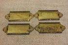 Martin Manor Antique Hardware Old and vintage hardware from the distant past and including some recent items 4 Old Card Holders Labels Name Plates 15/16 X 2 1/2” Tarnished Brass Vintage These drawer card holders are old and were used and nicely aged. The card holders are solid brass and a magnet will not stick. They have nicely tarnished and darkened with time. Nails are included They were on drawers in an old woodworkers shop. Each card holder is 15/16 ” tall x 2 1/2 ” long . The card would be 7/8" x 1 5/8 ” . 3-25-19 I -37 Shipping is NOT refundable on returns Visit our store for see more great items! Martin Manor Antique Hardware Welcome to my listing. I am located in Pennsylvania, USA and I have been an eBay Member since 1999 and I became a full time eBay seller in April 2007 State Sales Taxes Ebay collects state sales tax. If you are sales tax exempt, you will need to submit your exemption number to Ebay. I cannot exempt you. Shipping Please check your address BEFORE you buy. I can't guarantee I will remember to fix wrong adresses. Safe and secure delivery is my main concern so I pack very well to prevent any damage. Express Shipping is non-refundable after your package is sent. Returns You must use eBay's RETURN SYSTEM for proper tracking, refunding of sales tax and fees. On listings that had FREE shipping, the SELLER might pay return shipping. Claiming "Doesn't match description or photos" or "Doesn't fit" won't automatically get you free return shipping. If I made a drastic mistake in my description or photos, the SELLER will pay return shipping. International Buyers PLEASE READ: All International shipping is now being done through the eBay International Shipping program where you will pay for delivery charges at checkout and you will pay for any customs charges, import fees and taxes either at checkout or when your item arrives.~~~When you buy an item using eBay International Shipping, you can benefit from lower international shipping costs negotiated by eBay. Keep in mind that to combine shipping on a purchase of multiple items you MUST contact me BEFORE purchases are made to combine into one sale to save shipping charges.~~~Once you've completed checkout, I will send your item to eBays shipping hub, and from there it's shipped to you. Tracking is automatically added so you can track your item from the hub to your door.~~~Pro tip: International purchases are covered by eBay Money Back Guarantee as long as all other eligibility requirements are met. 2/2024 _gsrx_vers_1703 (GS 9.9b2 (1703))