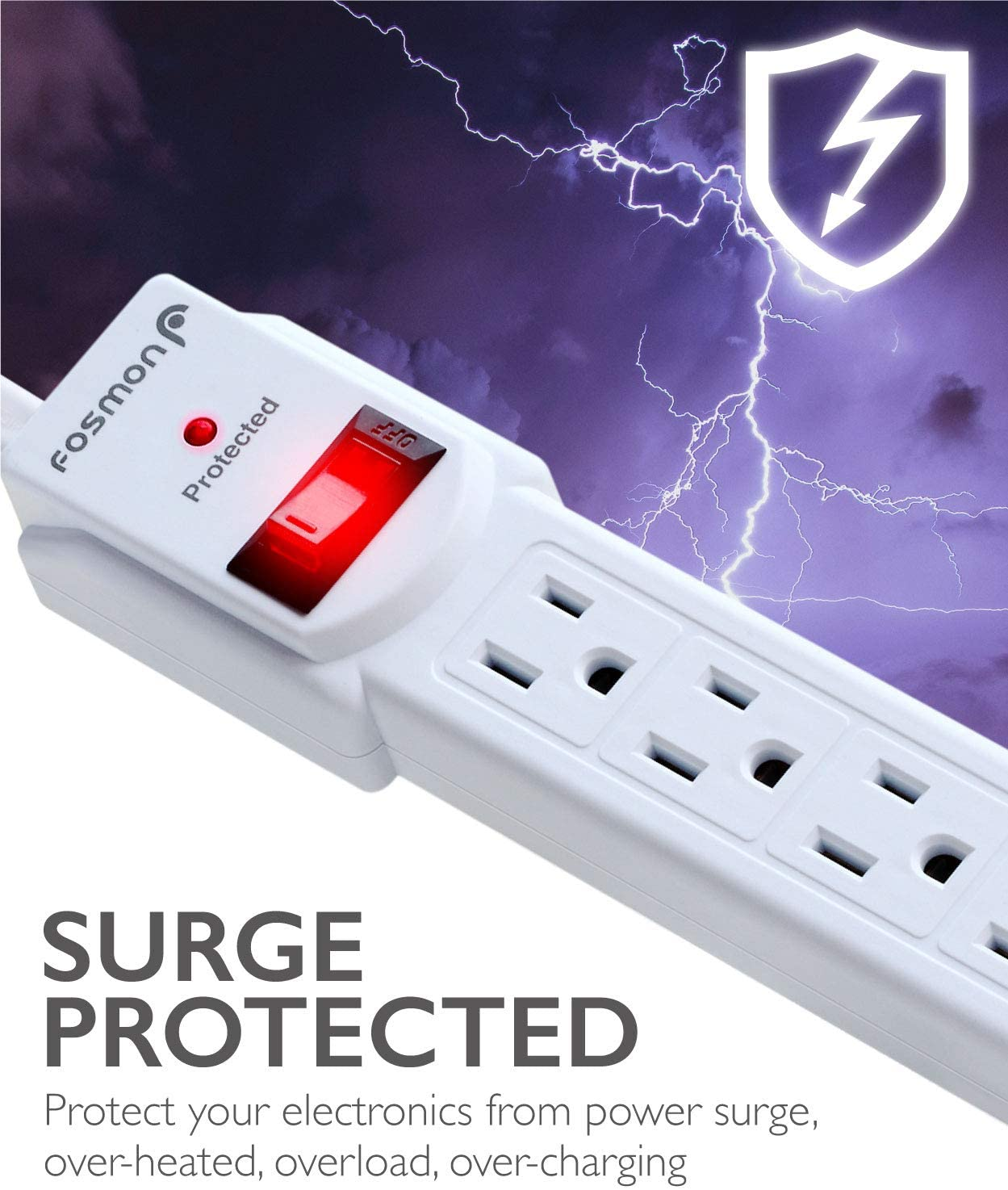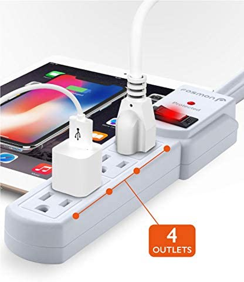 [EASY MOUNTABLE DESIGN & FLAT PLUG] The surge-protected extension cord triples the number of available sockets over standard wall outlets with a total of 4 120v AC outlets. The low-profile flat plug fits easily in tight spaces, 45° right angle plug design prevents other plugs blocking. The mounting holes allows this power strip to be installed on the wall or desk easily without measuring. [LIGHTED LED ON/OFF SWITCH] Fosmon's 4 outlet small power strip use a red LED ON/OFF rocker style switch, making it easy to locate and operate in the dark. [RELIABLE SURGE PROTECTION] Our small surge protector power strip provides 490 joules of surge suppression to prevent voltage spikes from damaging your electronics. The Protected LED indicates that the surge protection is available. [HEAVY DUTY] Built-in 3ft heavy cord enables connection to a long distant wall outlet, This mini size surge protector power strip will carry a total capacity of 1875W 15A. 4 Grounded 3 prong outlets allow you to safely plug 120v AC devices into each one. [LIMITED LIFETIME WARRANTY] Join millions of satisfied customers with our limited lifetime warranty, backed by our experienced and dedicated USA based customer service. Product description Surge Protected Power Strip to Expand Wall Outlets Fosmon's 4 outlet power strip triples the number of available sockets in standard wall outlets. With its plug capacity, long cord, and surge protection, you can safely and efficiently plug in multiple devices at once. Its slim design makes it perfect to use behind furniture or appliances. Lighted LED Rocker Style ON/OFF Switch Fosmon's 4 plug power strip offers a built-in LED lit rocker style ON/OFF switch, making it easy to locate and use in the dark. Reliable Surge Protection The surge protector provides 490 joules of surge protection to prevent voltage spikes from damaging your electronics. The Protected LED indicates that the surge protection is available. Sturdy and Safe Power Strip With its 4 grounded outlets and 3-foot extension cord, the power strip is perfect for use in TV rooms, garages, living rooms, and offices. The strip carries an 1875 watt, 15 amp capacity, more than enough to safely power your appropriate devices. Specifications Plug Capacity: 4 Grounded Electrical Rating: AC 15A 125V 60Hz 1875W Surge Protection: 490 Joules Cable Length: 3 feet (1 meter) Cable Gauge: SJT 14AWG 3C Indoor Use Only