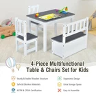 4 PCS Children Wooden Activity Table Set With 2 Chair Storage Bench & Study Desk ● Multifunctional Table Set: Composed of a dining table, a long bench and 2 chairs, the kid table set can accommodate 3-4 children at the same time. Except for drawing, it can also be used for different purposes, such as reading, writing, dining, etc. Therefore, the table set is suitable for home and kindergarten. ● Sturdy and Durable Material: Made of selected MDF and pine wood, the entire constructions presents excellent stability and great weight capacity. Moreover, as the materials are odorless, the 4-piece toddler table set is without any harmful chemicals, so it is very safe for your children. ● Hidden Storage Space: In addition to being a practical kid table set, it also provides you with ample storage space. Inside the storage bench is a spacious compartment where you can store toys, books, clothes, shoes, snacks, etc. In this way, a lot of items can be stowed in a hidden manner. ● Child-Friendly Design: Both appropriate seat heights and ergonomic backrests allow children to sit healthily and comfortably. Besides, designed to be grooved, the top lid of storage bench is effortless to open and can prevent you from being pinched, which significantly improves safety. ● Effortless Assembly: The whole assembling process only requires simple steps and common tools. With a short time, you can easily and quickly get an exquisite 4-piece kid table set. What’s more, its smooth surface requires simple cleaning making the daily maintenance much easier. Color: Gray Material: MDF, Wood Table size: 27.5" (L) X 19" (W) X 20" (H) Storage stool size: 23" (L) X 10.5" (W) X 21" (H) Chair size: 10" (L) X 10" (W) X 21.5" (H) Net weight: 37.5 lbs Age range: 3 - 5 years old Table weight capacity: 110 lbs Storage stool weight capacity: 110 lbs Chair weight capacity: 60 lbs