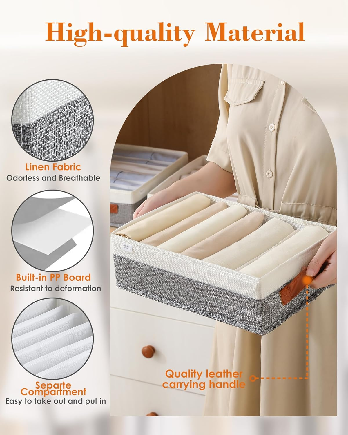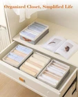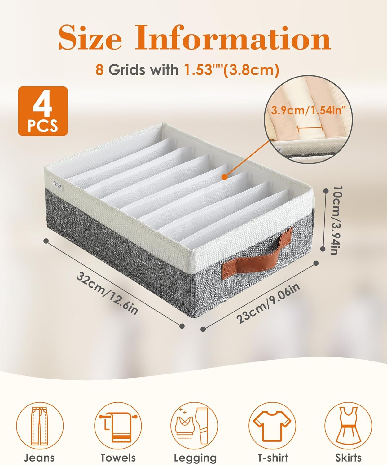 👚MULTIFUNCTIONAL: The T-shirt organizer is perfect for lightweight T-shirts, leggings, socks, belts, silk scarves, and other small items. The shirt organizer for the closet fits easily into large drawers, wardrobes, closets, and cabinets, offering a flexible storage solution for your everyday needs. 👕PREMIUM MATERIAL: The shirt organizer is made from high-quality linen and PP board, crafted with meticulous attention to detail. The fine stitching ensures durability and reliability. Not only does the t-shirt organizer drawer have an elegant appearance, but it is also washable, making it easy to clean and ideal for long-term use. 👚FOLDABLE: T-shirt drawer organizers feature a convenient foldable design, allowing easy unfolding and quick setup. It can be swiftly folded and stored away when not needed, saving space. 👕FITS MOST STANDARD T-SHIRT SIZES: The internal compartments of t-shirt organizers for shelves are made from mesh fabric with some elasticity, allowing them to adapt flexibly to various T-shirt sizes. According to our test data, a shirt organizer for a drawer can hold approximately 8 small-sized T-shirts or 6 large-sized T-shirts, meeting a range of storage needs and keeping your clothes neatly organized. This helps you make better use of your space. (Note: Long sleeves are not suitable.) 👚KEEP YOUR CLOSET NEAT: Using a t-shirt storage organizer for the closet will make your closet more organized and tidy, eliminating the frustration of not finding your T-shirts. The clothes drawer organizer not only categorizes your T-shirts clearly but also helps you quickly locate the clothes you need, making your daily routine more convenient and stress-free. Product Description High-Quality Handles The T-shirt organizer features premium leather handles, providing a comfortable and secure grip. These sturdy handles make it easy to carry and move the organizer, ensuring convenience and durability for everyday use. Foldable The T shirt organizer for closet features a convenient foldable design that allows for easy unfolding and quick setup when in use. When not needed, it can be swiftly folded and stored away, effectively saving space. Washable The T-shirt organizer is washable, allowing for effortless cleaning and maintenance. This feature ensures that it remains hygienic, extending its lifespan and keeping your storage solution looking like new. Fit most T shirt The internal compartments of t-shirt organizers for shelves are made from mesh fabric with some elasticity, allowing them to adapt flexibly to various T-shirt sizes.