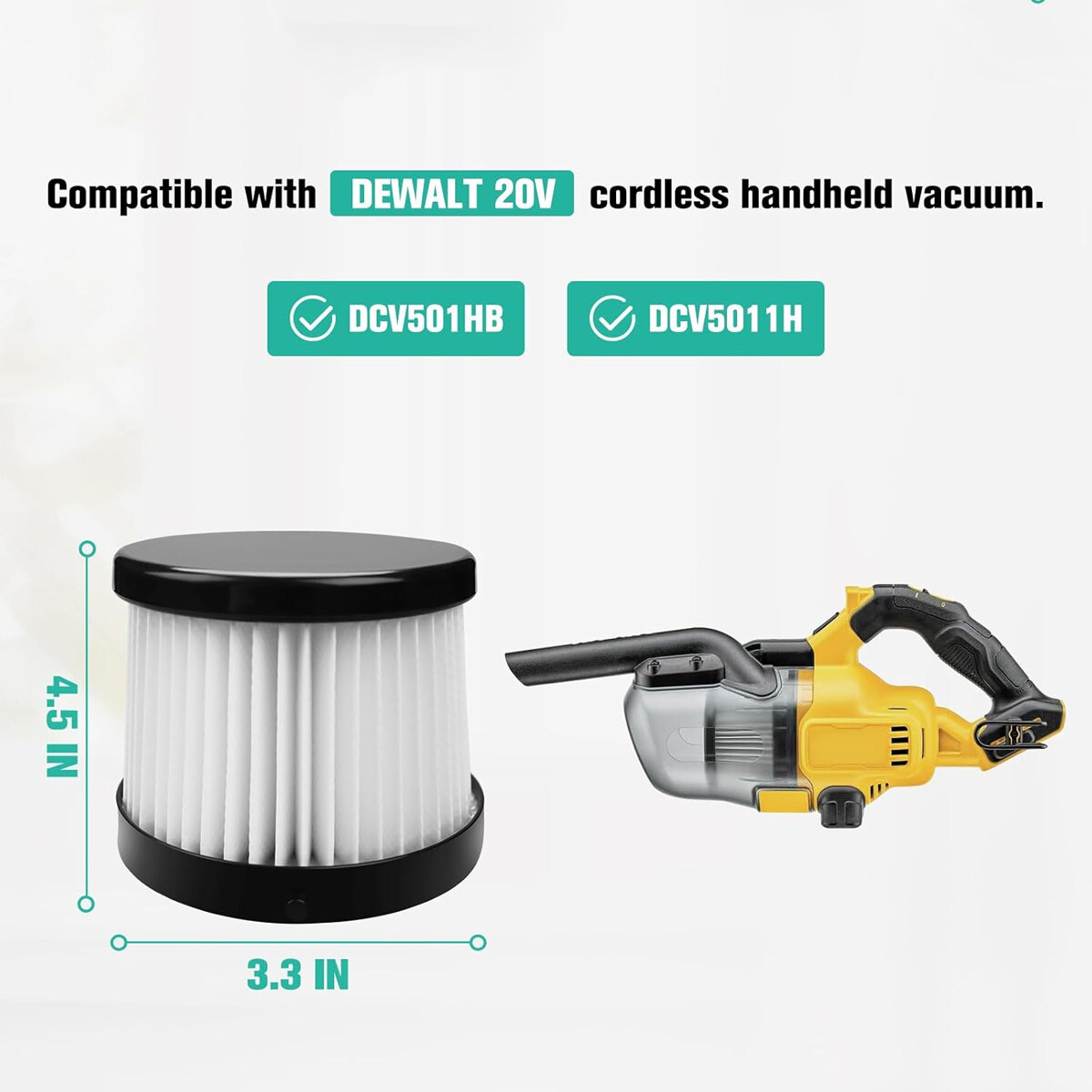 Product Details: DCV501HB Replacement Filter Perfectly compatible with DEWALT DCV501HB 20V Cordless Handheld Vacuum Parts, It is comparable to part number No# DCV5011H. Please confirm your model number before purchasing. Features: Fully Compatible with DEWALT DCV501HB 20V Cordless Handheld Vacuum vacuum filter Replacement filter for DEWALT 20V Cordless DCV501HB Vacuum Cleaner Our DCV501HB filter Made of high material with high density and surrounded by a mesh effectively capable of blocking 99.97% of the particles such as dirt, sawdust, wood chips, fine powders, job site debris. Replacement FiltersEasy to Install dcv501hb For dewalt vacuum dcv501hb Note: if your vacuum gets hot when using or the suction gets weak, you need to replce the new filter in time. Filter is made of premium materials. Efficient filter for your cordless vacuum cleaner Filters ensure that particles, dust, dirt, wood chip, small particles, fine powder, and sawdust are removed from the air. The air flow is guided past the filter and the smallest particles, attracted by the fibers, stick to it. The Filters are washable and reusable, the cartridge filter is washable and reusable, and it can be easily cleaned. For optimal filter performance, please replace the filter every 2-3 months. Package Included: 4 × replacement filter On May 27, 2025 at 20:04:24 PDT, seller added the following information: