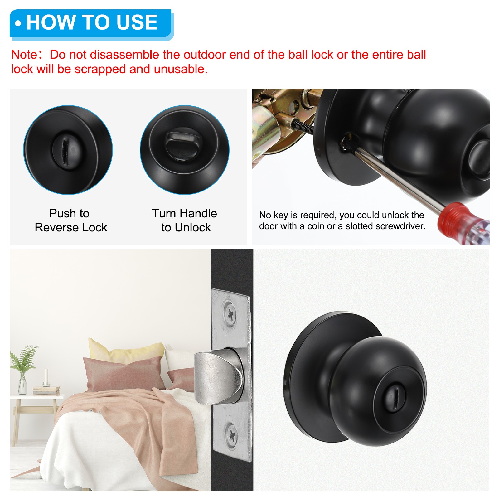 Document The interior doorknobs are perfect for rooms that require privacy, such as bedrooms and bathrooms. It is also suitable for wooden, aluminum composite, and colored steel doors. The clean, smooth lines of the privacy door handle complement the interior doors in your home.SpecificationColor: BlackMaterial: Stainless steelCenter distance: 60-70mm/2.4-2.8inchApplicable Door Thickness: 30-50mm/1.2-2inchCenter opening size: 48-60mm/1.9-2.4inchSide opening size: 22-25mm/0.9-1inchPacking List: Privacy Door Knobs x 4AdvantageThe latch can be locked by pushing the button on the inside and turning the handle to unlock. The emergency unlocks the door from the outside. Smoothly opens and closes the door, reducing the noise caused by opening and closing the door, so that your family can sleep all night long.InstructionDirect installation, pre-drilled holes, only a screwdriver is needed. The interior door handles do not have keys. In an emergency, it can be unlocked from the outside with a coin or flat piece of metal.Note: The door opening must be between 48-60mm/1.9-2.4 inches when replacing the ball lock or it will not fit. 4 Pack Key Entry Door Knob Interior, Black The interior doorknobs are perfect for rooms that require privacy, such as bedrooms and bathrooms. It is also suitable for wooden, aluminum composite, and colored steel doors. The clean, smooth lines of the privacy door handle complement the interior doors in your home. Specification Color: Black Material: Stainless steel Center distance: 60-70mm/2.4-2.8inch Applicable Door Thickness: 30-50mm/1.2-2inch Center opening size: 48-60mm/1.9-2.4inch Side opening size: 22-25mm/0.9-1inch Packing List: Privacy Door Knobs x 4 Advantage The latch can be locked by pushing the button on the inside and turning the handle to unlock. The emergency unlocks the door from the outside. Smoothly opens and closes the door, reducing the noise caused by opening and closing the door, so that your family can sleep all night long. Instruction Direct installation, pre-drilled holes, only a screwdriver is needed. The interior door handles do not have keys. In an emergency, it can be unlocked from the outside with a coin or flat piece of metal. Note: The door opening must be between 48-60mm/1.9-2.4 inches when replacing the ball lock or it will not fit. Hot Item Payment 1.We accept eBay payment . 2.Payment must be received within 7 business days of auction closing. Shipping 1.We ship to your eBay or Paypal address. Please make sure your eBay and Paypal address is correct before you pay. 2.Items will be shipped within 1-3 business day when we received payment. 3.Delivery time depends on destination and other factors. Description Policy 4 Pack Key Entry Door Knob Interior, Black The interior doorknobs are perfect for rooms that require privacy, such as bedrooms and bathrooms. It is also suitable for wooden, aluminum composite, and colored steel doors. The clean, smooth lines of the privacy door handle complement the interior doors in your home. Specification Color: Black Material: Stainless steel Center distance: 60-70mm/2.4-2.8inch Applicable Door Thickness: 30-50mm/1.2-2inch Center opening size: 48-60mm/1.9-2.4inch Side opening size: 22-25mm/0.9-1inch Packing List: Privacy Door Knobs x 4 Advantage The latch can be locked by pushing the button on the inside and turning the handle to unlock. The emergency unlocks the door from the outside. Smoothly opens and closes the door, reducing the noise caused by opening and closing the door, so that your family can sleep all night long. Instruction Direct installation, pre-drilled holes, only a screwdriver is needed. The interior door handles do not have keys. In an emergency, it can be unlocked from the outside with a coin or flat piece of metal. Note: The door opening must be between 48-60mm/1.9-2.4 inches when replacing the ball lock or it will not fit. Hot Item Payment 1.We accept eBay payment . 2.Payment must be received within 7 business days of auction closing. Shipping 1.We ship to your eBay or Paypal address. Please make sure your eBay and Paypal address is correct before you pay. 2.Items will be shipped within 1-3 business day when we received payment. 3.Delivery time depends on destination and other factors.