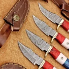 LOT OF 4 PCS! Handmade Damascus Hunting Knives – Multicolor Wood Handles Specifications: Overall Length: 6.5" Blade Thickness: ~4 mm Blade Material: Damascus Steel Handle Material: Multicolor wood and camel bone with mosaic pin with hand casted brass bolster. Includes: Leather sheaths Blade Craftsmanship: Blades are made from 1095 & 15N20 High Carbon Tool Steel with over 256 layers and a hardness of 58-60 HRC for durability and sharpness. Spine of the blade tang has excellent fire work Care Instructions: Sharpen with a Diamond Wet Stone at a 20-degree angle. Clean with soap and water, dry thoroughly, and apply gun oil. Store away from the sheath to prevent rust. Important Notes for Buyers: Verify your country’s import regulations before purchase. Customs duties, if any, are the buyer’s responsibility. Shipping & Returns: Free shipping included. 14-day return policy applies. Contact Us: Message us anytime. We respond within 24 hours.