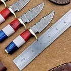 LOT OF 4 PCS! Handmade Damascus Hunting Knives – Multicolor Wood Handles Specifications: Overall Length: 6.00" Blade Thickness: ~4 mm Blade Material: Damascus Steel Handle Material: Multicolor wood and camel bone with mosaic pin with hand casted brass bolster. Includes: Leather sheaths. Blade Craftsmanship: Blades are made from 1095 & 15N20 High Carbon Tool Steel with over 256 layers and a hardness of 58-60 HRC for durability and sharpness. Spine of the blade tang has excellent fire work Care Instructions: Sharpen with a Diamond Wet Stone at a 20-degree angle. Clean with soap and water, dry thoroughly, and apply gun oil. Store away from the sheath to prevent rust. Important Notes for Buyers: Verify your country’s import regulations before purchase. Customs duties, if any, are the buyer’s responsibility. Shipping & Returns: Free shipping included. 14-day return policy applies. Contact Us: Message us anytime. We respond within 24 hours.