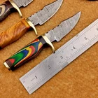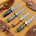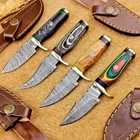 LOT OF 4 PCS! Handmade Damascus Hunting Knives – Multicolor Wood Handles Specifications: Overall Length: 6.00" Blade Thickness: ~4 mm Blade Material: Damascus Steel Handle Material: Multicolor wood with mosaic pins & hand casted brass bolster. Includes: Leather sheaths Blade Craftsmanship: Blades are made from 1095 & 15N20 High Carbon Tool Steel with over 256 layers and a hardness of 58-60 HRC for durability and sharpness. Spine of the blade tang has Excellent fire work Care Instructions: Sharpen with a Diamond Wet Stone at a 20-degree angle. Clean with soap and water, dry thoroughly, and apply gun oil. Store away from the sheath to prevent rust. Important Notes for Buyers: Verify your country’s import regulations before purchase. Customs duties, if any, are the buyer’s responsibility. Shipping & Returns: Free shipping included. 14-day return policy applies. Contact Us: Message us anytime. We respond within 24 hours.