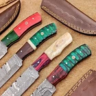 LOT OF 4 PCS! Handmade Damascus Hunting Knives , Skinner Knives Specifications: Overall Length: 8.50" Blade Thickness: ~4 mm Blade Material: Damascus Steel Handle Material: Hard wood and Resin / camel bone with brass pins mosaic pin Includes: Leather sheaths Blade Craftsmanship: Blades are made from 1095 & 15N20 High Carbon Tool Steel with over 256 layers and a hardness of 58-60 HRC for durability and sharpness. Spine of the blade tang has excellent fire work. Care Instructions: Sharpen with a Diamond Wet Stone at a 20-degree angle. Clean with soap and water, dry thoroughly, and apply gun oil. Store away from the sheath to prevent rust. Important Notes for Buyers: Verify your country’s import regulations before purchase. Customs duties, if any, are the buyer’s responsibility. Shipping & Returns: Free shipping included. 14-day return policy applies. Contact Us: Message us anytime. We respond within 24 hours.