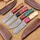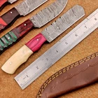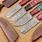 LOT OF 4 PCS! Handmade Damascus Hunting Knives , Skinner Knives Specifications: Overall Length: 8.50" Blade Thickness: ~4 mm Blade Material: Damascus Steel Handle Material: Hard wood and Resin / camel bone with brass pins mosaic pin Includes: Leather sheaths Blade Craftsmanship: Blades are made from 1095 & 15N20 High Carbon Tool Steel with over 256 layers and a hardness of 58-60 HRC for durability and sharpness. Spine of the blade tang has excellent fire work. Care Instructions: Sharpen with a Diamond Wet Stone at a 20-degree angle. Clean with soap and water, dry thoroughly, and apply gun oil. Store away from the sheath to prevent rust. Important Notes for Buyers: Verify your country’s import regulations before purchase. Customs duties, if any, are the buyer’s responsibility. Shipping & Returns: Free shipping included. 14-day return policy applies. Contact Us: Message us anytime. We respond within 24 hours.