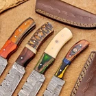 LOT OF 4 PCS! Handmade Damascus Hunting Knives , Skinner Knives Specifications: Overall Length: 8.0" Blade Thickness: ~4 mm Blade Material: Damascus Steel Handle Material: Hard wood with brass pins mosaic pin Includes: Leather sheaths Blade Craftsmanship: Blades are made from 1095 & 15N20 High Carbon Tool Steel with over 256 layers and a hardness of 58-60 HRC for durability and sharpness. Spine of the blade tang has excellent fire work. Care Instructions: Sharpen with a Diamond Wet Stone at a 20-degree angle. Clean with soap and water, dry thoroughly, and apply gun oil. Store away from the sheath to prevent rust. Important Notes for Buyers: Verify your country’s import regulations before purchase. Customs duties, if any, are the buyer’s responsibility. Shipping & Returns: Free shipping included. 14-day return policy applies. Contact Us: Message us anytime. We respond within 24 hours.