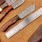 LOT OF 4 PCS! Handmade Damascus Hunting Knives , Skinner Knives Specifications: Overall Length: 8.0" Blade Thickness: ~4 mm Blade Material: Damascus Steel Handle Material: Hard wood and camel bone with brass pins mosaic pin Includes: Leather sheaths Blade Craftsmanship: Blades are made from 1095 & 15N20 High Carbon Tool Steel with over 256 layers and a hardness of 58-60 HRC for durability and sharpness. Spine of the blade tang has excellent fire work. Care Instructions: Sharpen with a Diamond Wet Stone at a 20-degree angle. Clean with soap and water, dry thoroughly, and apply gun oil. Store away from the sheath to prevent rust. Important Notes for Buyers: Verify your country’s import regulations before purchase. Customs duties, if any, are the buyer’s responsibility. Shipping & Returns: Free shipping included. 14-day return policy applies. Contact Us: Message us anytime. We respond within 24 hours.