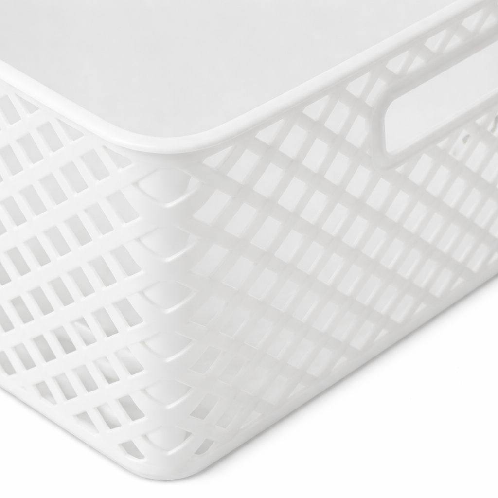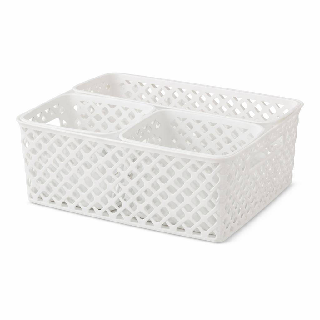 Decorative Storage Baskets – Set of 4 White Plastic Organizer Bins for Home Storage Product Description The Decorative Storage Basket Set offers a simple and stylish way to keep everyday items organized without taking up unnecessary space. Designed to fit easily in bedrooms, kitchens, closets, and living areas, these baskets provide flexible storage options for both small and larger essentials. Crafted from sturdy plastic with a modern diamond-pattern design, these bins are built for long-lasting use. Their open mesh construction allows air and light to circulate, helping reduce moisture buildup while keeping contents visible. Whether used individually or together, these baskets help create a cleaner, more organized home. Key Features Space-Efficient Storage: Designed to hold everyday essentials while fitting neatly into shelves, closets, or cabinets. Durable Plastic Construction: Made from premium plastic with a reinforced diamond pattern for added strength. Portable Design: Built-in cut-out handles make lifting and transporting items quick and easy. Ventilated Mesh Style: Allows airflow and visibility, helping prevent mold and making contents easy to identify. Nesting Capability: Baskets nest together when not in use for efficient storage. Specifications Feature Details Material Durable Plastic Color White Design Diamond Pattern with Mesh Ventilation Care Wipe clean with mild soap and warm water Recommended Uses Bedroom organization and toy storage Kitchen and pantry essentials Closet and shelf organization Bathroom supplies and linens Garage tools and accessories Package Includes 1 × Medium Decorative Basket (14" × 11.6" × 5.3") 1 × Long Decorative Basket (13.6" × 5.5" × 5.1") 2 × Mini Decorative Baskets (6.7" × 5.5" × 5.1") Why You’ll Love These Baskets These decorative baskets combine durability, portability, and modern design to create a versatile storage solution. Whether organizing a single shelf or an entire room, they help keep your space tidy while maintaining a clean, coordinated look.