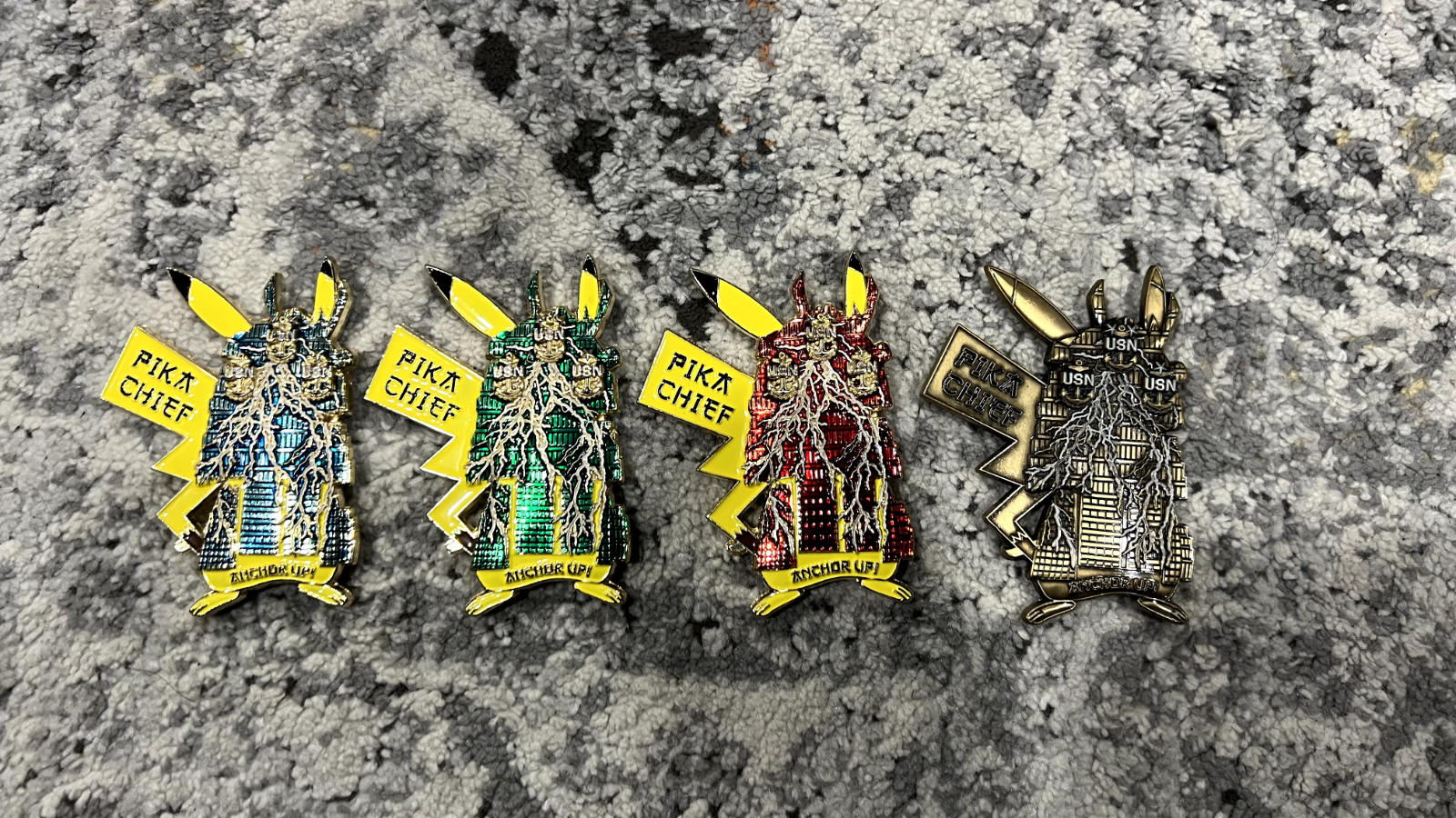 The product is a set of 4 original Samurai Pikachu Navy Chief CPO challenge coins. These coins feature a unique theme combining samurai and Pikachu designs, making them a collectible item within the militaria category.