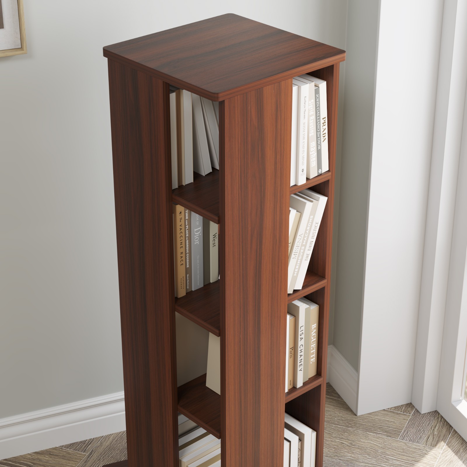 4 Tiers Corner Spinning Bookcase Organizer 360° Rotating Bookshelf Tower Walnut for Home Office Specifications: Color: dark walnut Material: MDF Overall Dimension: 16.93" X 16.93" X 56.18" Package Includes: 1pc bookcase and all accessories for installation Features: ORGANIZED AND BEAUTIFUL - Make your books neat and organized with this rotating bookshelf tower lazy susan; The space saving design can hold up many books in a compact space. 4-TIER BOOKSHELF DISPLAY - Keep your home clean and keep track of your books better with this spinning bookcase tower; Makes every book visible and save so much of your room book storage space. MORE BOOKS IN LESS SPACE - With the spinning design, this book shelf organizer can hold lots of books in the small area; The modern look can fit in bedrooms, living rooms, children's rooms, study rooms and playroom. 【Easy to assemble】We provide all hardware and accessories for this bookshelf, it comes with simple, easy-to-follow instructions, it can be easily assembled without additional tools, I believe you can have it right away. Tips: You may receive 2 or more flat packages for some products in our shop, please track all the tracking numbers we update to you. Notes: It takes some time to install the furniture, please don't be worried about the installation, and please pay attention to your safety while installing. We will ship from the US warehouse, you need to wait longer time than usual during the current special epidemic situation, please track the package delivery information at any time. If there is no stock for the accessories which are necessary for installation in the US warehouse, we will arrange the replacements from our warehouse in China directly, but it will take longer time for your patient waiting. Please do not be hesitate to contact us for any questions you have before or after purchasing, we are always online and will try our best to help you to solve it.