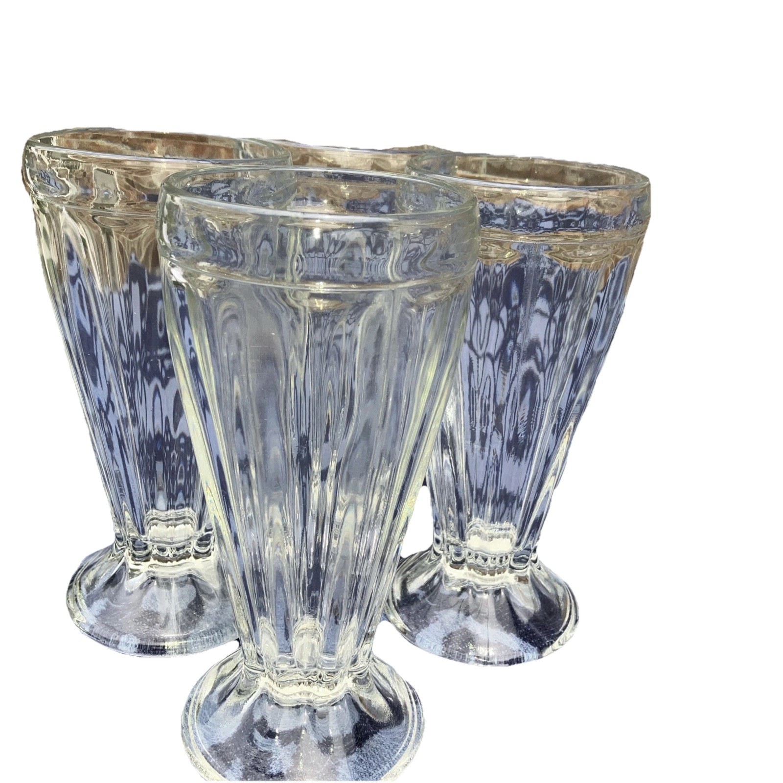 This set of 4 vintage Soda Fountain Parfait Glasses features a fluted pattern, clear color, and a mid-century modern style. Made of pressed glass in the 1950s, these 7-inch glasses are perfect for serving milkshakes, sundaes, and ice cream sodas. With a retro Americana theme and a fused glass production technique, these unique glasses are a nostalgic addition to any home bar or collection. Each glass weighs approximately 1 lb 6 ozs, making them sturdy and stylish for all your soda fountain dreams.