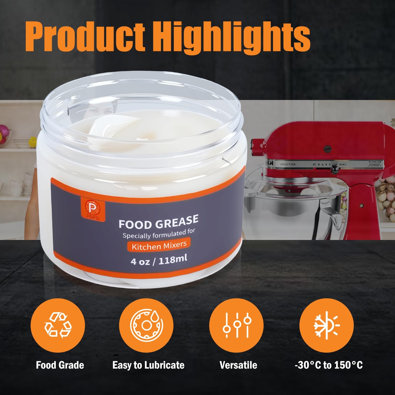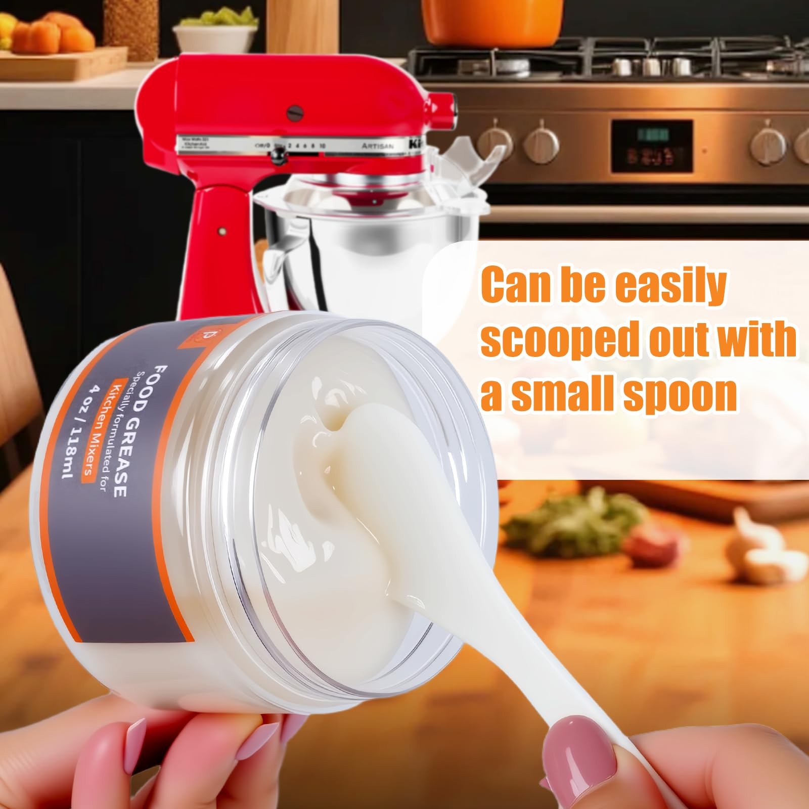 4 oz Food Grade Grease is universally compatible with Stand Mixers, ensuring a perfect fit and optimal performance to maintain mixer function and extend its lifespan, reduces mechanical wear on gear parts (insufficient grease can damage the mixer, so replacing it when necessary is highly recommended), enhances performance by providing adequate lubrication for various applications and maintenance tasks—helping the equipment run quieter and more efficiently, reducing operating noise, and improving overall mixer performance—offers affordable quality with high-quality, food-safe grease at a budget-friendly price (re-greasing is a quick and easy process that saves unnecessary costs, and each 4-ounce bottle is usually sufficient for full service or re-greasing most machines), and comes with tips: grease may melt slightly at high temperatures, so simply store it in the refrigerator or a cool place for a short time to re-solidify, and keep it out of reach of children during storage.