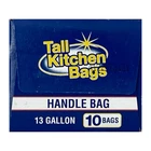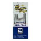 About this item 10 count 13 gallon Convenient handle closure Affordable Tall trash bags Ideal and convenient for everyday household use Made from LDPE plastic Come in an easy-to-open cardboard box