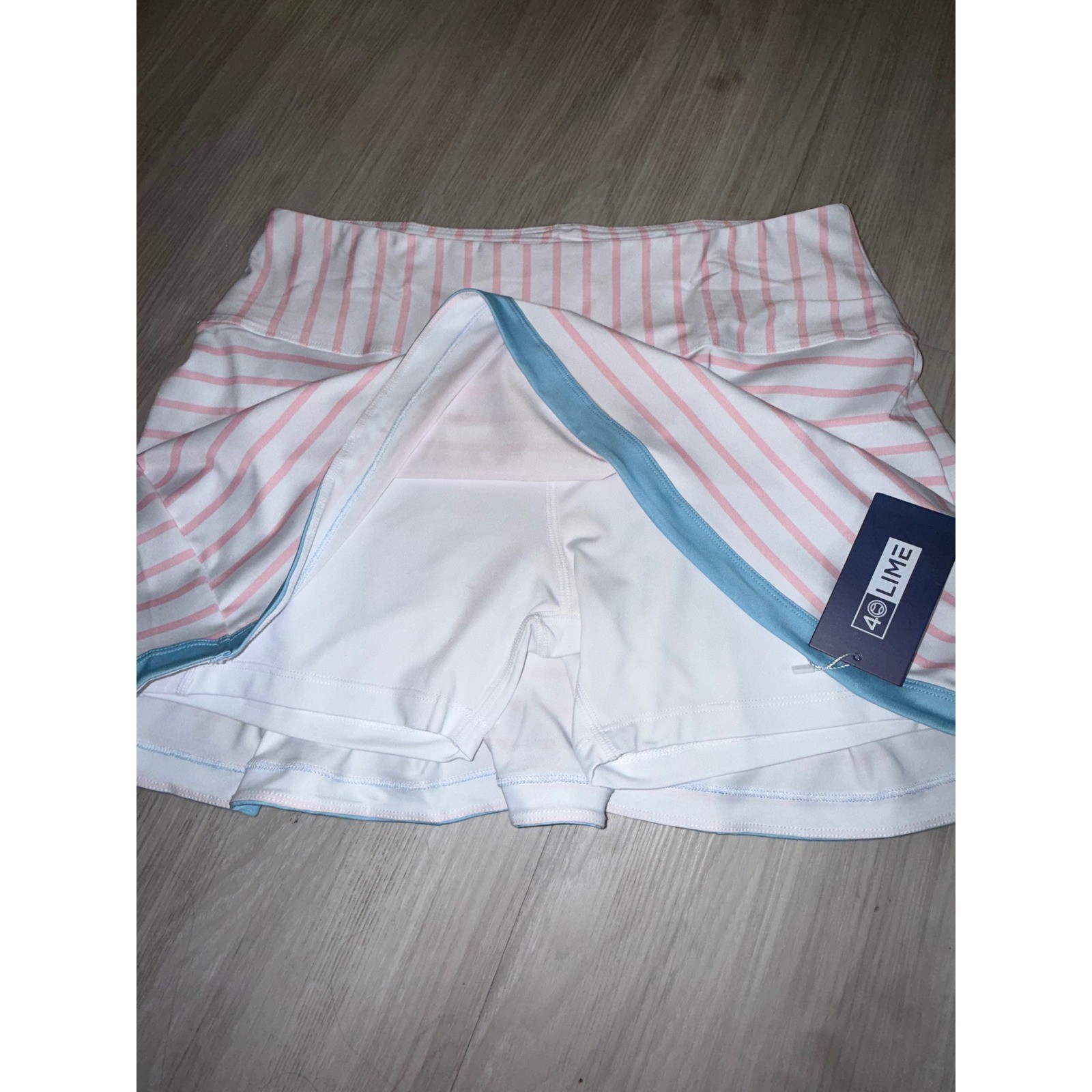 40 Lime tennis skort features a classic striped pattern in pink and white with a contrasting light blue trim at the hem. Designed for athletic performance, this piece includes built-in white compression shorts for coverage and comfort during movement. The wide, flat waistband provides a secure fit, while the back features subtle pleating for added flair and mobility on the court. Measurements: • Waist: 16" (32" doubled) • Length: 14.5" • Hem Width: 23"