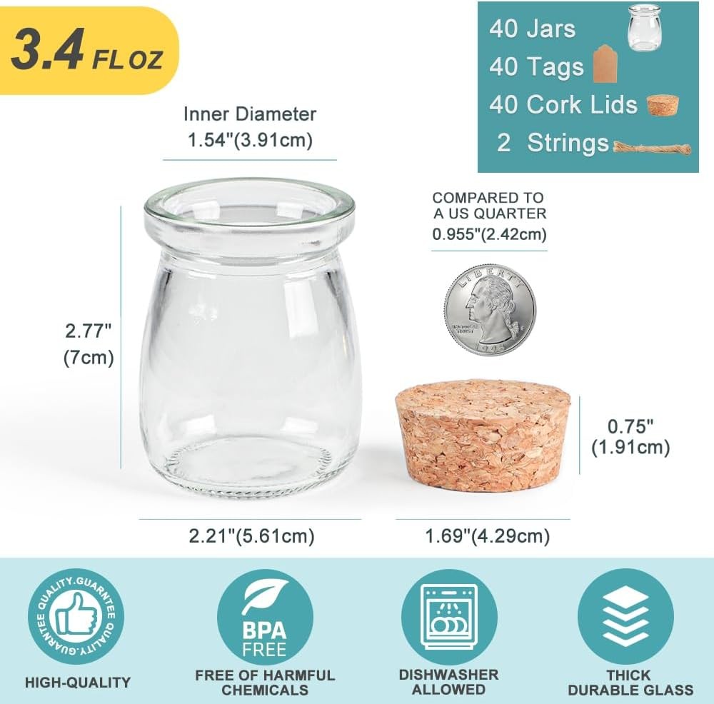 Free eBay listing template designed by dewiso.com 40 Pack Glass Favor Jars with Cork Lid, 3.4 oz Small Glass Bottles for Wedding Favor, Baby Shower, Party Favor, Gift Jars for Candy, Bonus Twine and Labels FREE AND FAST SHIPPING! About this item Durable: The glass jars with cork lids are made of premium material,3mm thick glass allows the glass spice jars to last for years. Even if you decorate the cute jars in an exaggerated way, it’ll look like new jar after every time you wash it. Specification:The glass jars with lids measurement approx 2.21”Diameter x 2.77”Height,1.54”Opening. 3.4oz mini mason jars are great to store as jam jars, spice, pebble, potion bottles, candle jars and so on. Accessories: Extra 2 bundles of string and 40 labels for convenient perfect presentation & personalization. Use your imagination to decorate them as wonderful wedding favors or baby shower favors for guests. Great Gift Jars: The small jars with lids look very aesthetic and cute, perfect for party favors, wedding favors, shower favors, filled with mousse and small desserts. Nice small jars for chocolate candies. Notes: Please soak the jelly jars in warm water first if you need to pour boiling water or hot liquid inside, especially use the small mason jars as candle containers. Product We offer a 30-Day Return Policy on items which you are not completely satisfied with. You have the option for a full-refund or an exchange of the item. No returns are available on items shipped outside of the US . Shipping We offer Free Shipping to the US and ship within 2 business days of payment, usually sooner. We use UPS express shipping. That's why your products are usually delivered within 3 days . Contact We try our very best to make sure every customer is completely satisfied. If there's a problem , message us! We're happy to help. 24/7 live chat available.