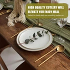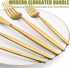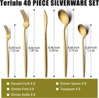 40 Piece Gold Silverware Set for 8, Terlulu Stainless Steel 40 Piece, Product Details Brand: Terlulu Number of Pieces: 40 Material: Stainless Steel Color: Gold Product Care Instructions: Hand Wash Only Recommended Uses For Product: Indoor Special Feature: Rust Resistant Finish Type: Polished Included Components: 8 dinner knives, 8 dinner forks, 8 salad/dessert forks, 8 dinner spoons, 8 teaspoons Style: Modern Item Weight: 1.87 Ounces Is Stain Resistant: Yes Is Dishwasher Safe: No Package Dimensions: 9.29 x 5.79 x 2.28 inches Item Weight: 1.87 ounces Country of Origin: China 【PREMIUM STAINLESS STEEL MATERIAL】 This gold silverware set is made of food grade 18/0 stainless steel without any harmful substances, rust resistance and nickel free, healthy and durable for everyday use. Professional vacuum electroplating technology for better stability of coating gold shinning metallic surface. 【SERVICE FOR 8】 Terlulu 40 piece gold silverware set for 8 includes 8 dinner forks, 8 dinner spoons, 8 dinner knives, 8 teaspoons, 8 salad/dessert forks in normal size, perfect for most families. 【MODERN&ELEGANCE STYLE】 Matte gold silverware set adds the perfect touch of class and refinement to any place setting. Its modern silhouette and design, the slim profiles and pointed stems add a sophisticated, minimalist touch to your dinner table. With sleek simple design, the elegant gold flatware is perfect for family daily use, parties, wedding, hotel, restaurant, formal dinner, etc. 【PROPER WEIGHT AND ELONGATED HANDLE】 Nice weight stainless steel silverware set, not flimsy, solid construction and durable, never bend in daily use. Thin and long handle and the appropriate weight are added to perfect balance and ensure maximum comfort during use that avoids you feeling tired. 【Tips】Satin flatware never needs polishing. Hand wash recommended to preserve the surface gold titanium coating and do not wash in the dishwasher, dry them before storing to prevent water spots or potential corrosion. If you have any questions about our silverware set, please contact us and we will solve it for you within 24 hours.