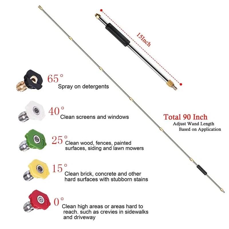 Product Description Product Description 1. The Cleaning Tool Are Made of Brass and Stainless Steel. Working Pressure Is up to 4000 Psi. Working Temperature Is up to 140 ℉. 2. You Can Adjust the Total Length of Wand Freely According to Your Needs. Specifications: Product: High Pressure Spray Wand Material: Stainless Steel Color: Gold&Silver Quantity of O-ring: 10pcs Quantity of Nozzles: 6 Nozzles: 0° Red,15° Yellow,25° Green,40° White,Soap Black Application 1.Ideal for Nozzle, Undercarriage Cleaner, Water Broom, Surface Cleaner and Cleaning Brushes. 2.Also Can Be Used to Clean Areas Such As Siding, Shutters, Windows and More. Note: 1. We provide clear pictures, measurements where possible. 2. The color of the actual items may slightly different from the listing images due to different displays. 3. There may be slight error due to manual measurement. Please make sure you do not mind before purchase. 4. Please leave a message before you give a bad feedback, if the products have some problems. Thank you for your kindly understanding. Shipment Payment Return & Refund Feedback Shipment All item will be carefully packaged very well with safe material and shipped to US States. Items will be sent in 2 working days,usually shipped by USPS Priority Mail. It will take about 3-5 days to US addresses. If you would like to ship by other shipment methods,please contact us.( shipping cost will be combined for multiple items you purchase at a time.) Payment Only PayPal is acceptable.It is a safe and easy payment method for buyers. Please pay in 48 hours after you win the item(s).If payment cannot be made in five days,your order(s) will be claimed as unpaid case and the item will be relisted. Return & Refund Customer satisfaction is our first priority. 30-days return is available after delivery. However, return shipping and insurance cost will be on buyers. Please email us before returning. Delivery date will be different according to UPS or USPS tracking system, so please inspect your item immediately upon arrival. Money will be return to you after the return item is sent back. We can not refund to you, if your return item is broken or damaged. Please ensure its safety. Feedback Your feedback is very important to us. If you can't leave us a "5-Star" rating and a positive feedback, please contact us without hesitation before leaving feedback. We are eager to work with our customers. We believe in communication. Give us a call or send us an email, we will make things right for our buyers. Positive feedback for our buyers will be left automatically by eBay Seller Manager Pro.