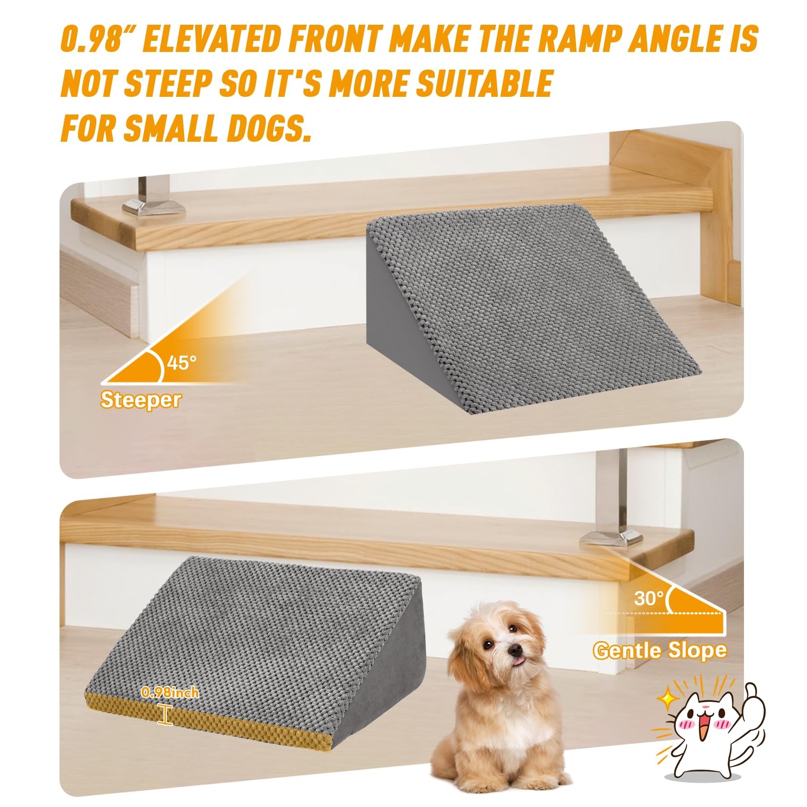 Q: Why your team designed this kind of small dog ramp? A: We have our pets also, and we love them very much. Some small dogs can't get on staircase with their own. Sometimes, it may be inconvenient for us to help them, and in order to solve problems like we went out or busy, we figured out this soft foam pet stairs. Suitable for small pets: Our pet stairs can be suitable for puppies, short-legged dogs(such as dachshund, corgi, pug, bulldog), small dogs, injured cats and so on. pet stairs are an comfortable way to help pets reach their favorite high places. Pet foam stairs highlights If your pet is small, short-legged or has problems such as arthritis, we suggest you try the soft, lightweight but sturdy pet foam stairs. If your pet likes to jump a lot, you can also try our pet stairs. When used, they can walk up instead of jumping up, so it can help prevent back pain. If your pet is a small dog such as a Poodle, Pomeranian, Chihuahua, Bulldog, Yorkshire Terrier, Shih Tzu, Dachshund, etc., our pet stairs will work well. After using foam pet stairs: Most pets got less back and joint problems after using foam pet stairs when they do less jumping up/down. Comfortable angle design The 17.5 degree design will make your injured/old pets easier to climb on. Anti-slip corduroy fabric We use warm and thick corduroy as the cover to anti-slip and anti-scratch. Product dimension: our pet stairs is suitable for weight under 40 lbs than old version 20lbs; suggest staircase height from less than 7 inches; Kindly remind: 1. Please allow 1 cm error due to manual measurements. Package include: Pack of 3 or 6 foam pet stairs 6 or 12 Pairs of Self-adhesive tapes High Density Foam & Suits for All Small Dogs: Our dog ramp use upgraded 40D high resilience and high density foam not than 30D that are not easily deformed and give better support. The cover is removable and machine washable. It's suitable for puppies, short-legged dogs(such as dachshund, corgi, pug, bulldog) and cats Suitable for Most Staircases & Care for Small Pets: Our small dog ramp size is 15*9.8*5.5 inches (L*W*H) and is compatible with most stairs heights at home.Typically around 7 inches. Soft material and sturdy foam is good for your dogs joints and backs than hard material Anti-slip Bottom & Sticky Tapes: Our dog stairs for small dogs bottom is anti-slippery and we also send you self-sticky pads for fixing our stairs to your staircase so make your dogs safety Let Foam Expand & No Assembly Required: Please note our small dog ramp is compression packed. So after received, please wait for several hours for the stairs foam expanded to it’s right shape. And then put in on your staircase and use the sticky pads to fix Boost Pets Confidence and Be More Patient with Your Pets: Keep your small stairs for your small dogs and skip the return process! Please understand some small pets may be unfamiliar with dog ramp so please be more patient and encourage them when training. They will grow up