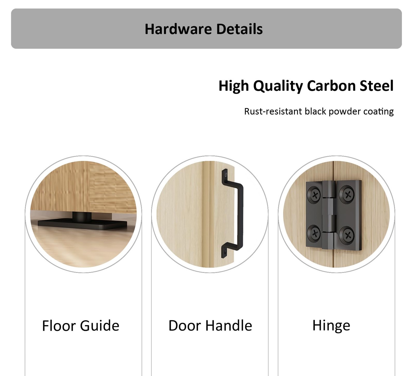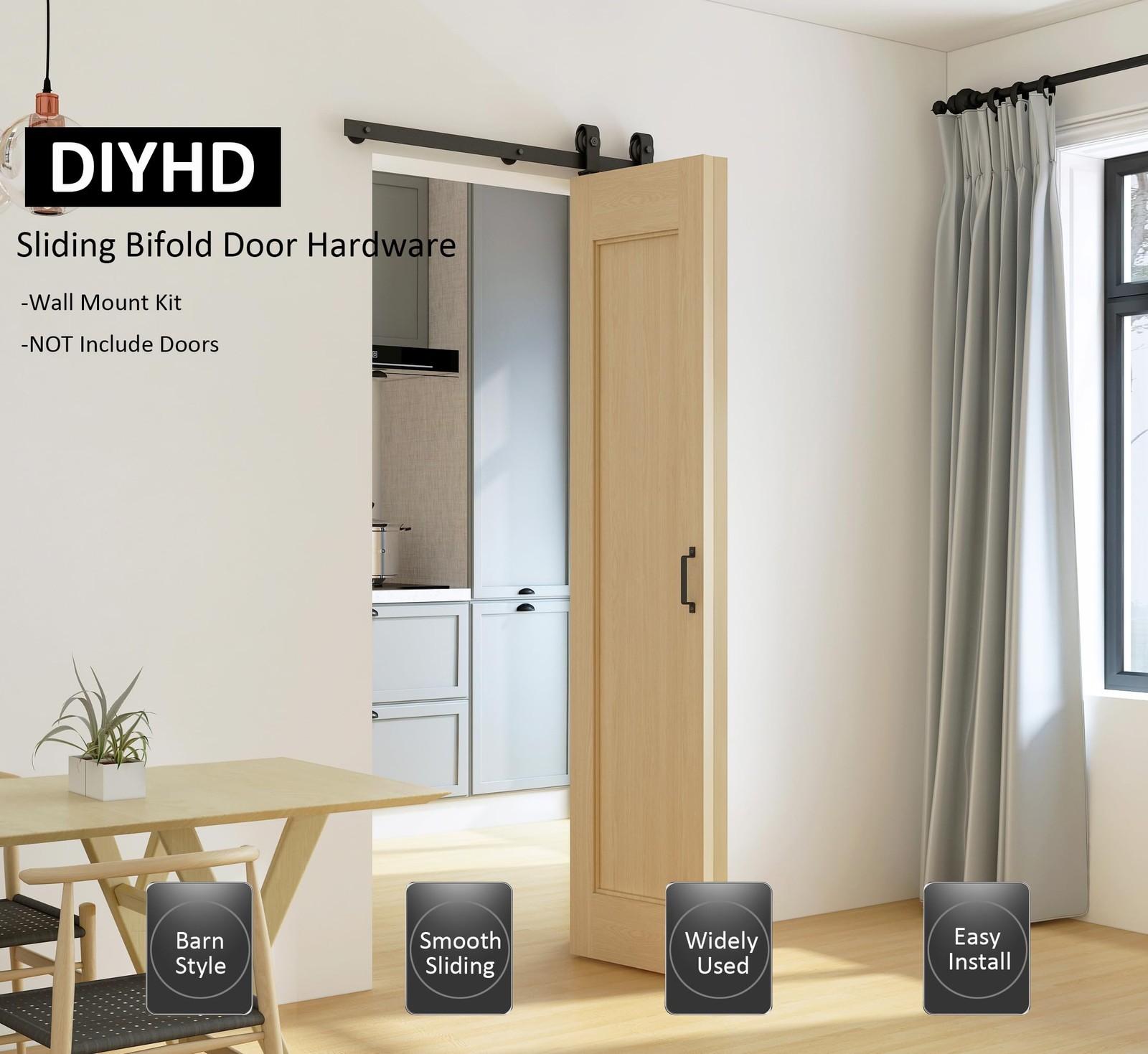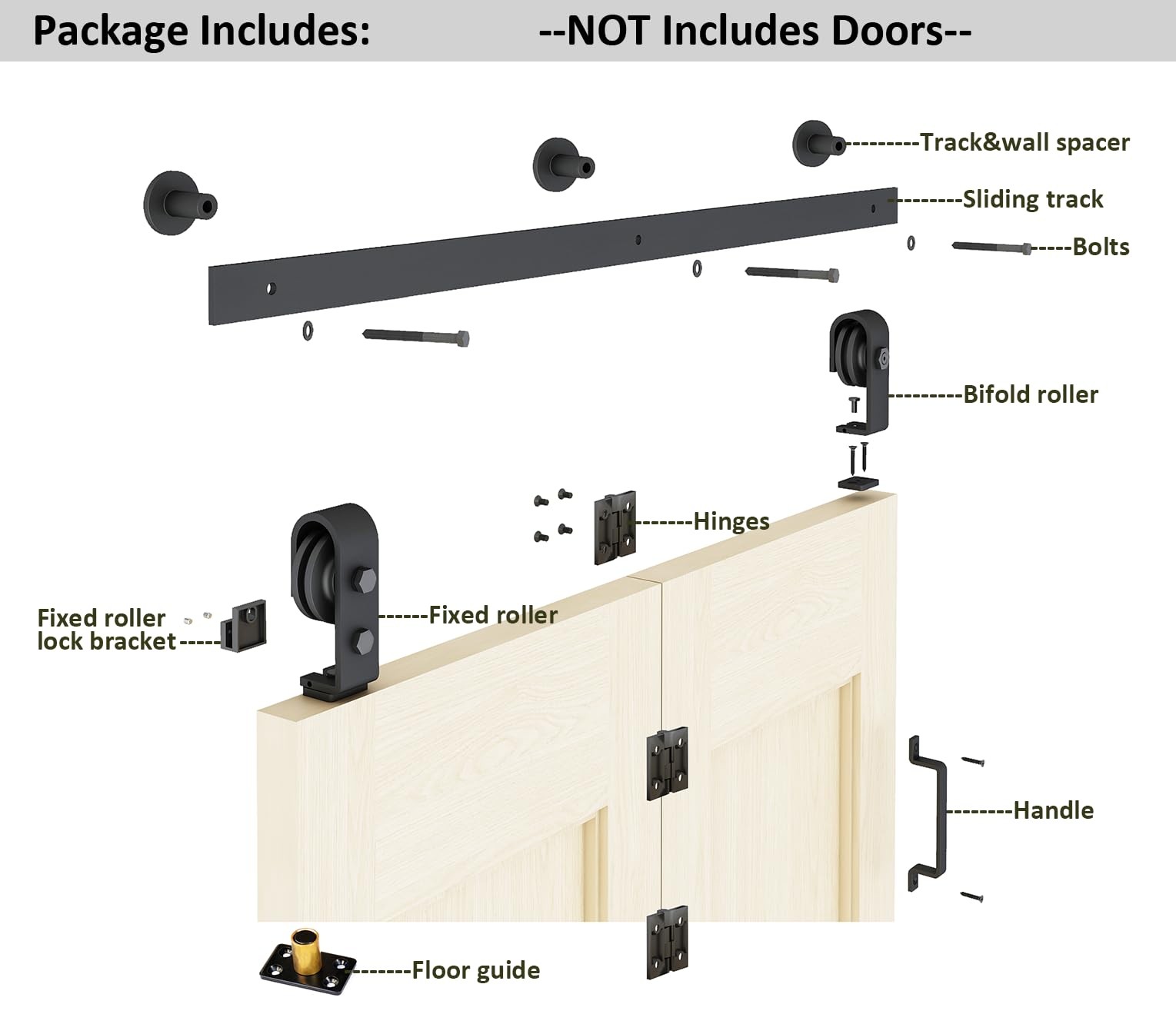 Sliding Bifold Barn Door Hardware [Hardware Only]: This set includes hardware components for your door system but does not include the door panel itself. [Package includes]:40" track X1,Track&wall connector X2,Floor guideX1,HingeX3,Fixed rollerX1,Bifold rollerX1,Fixed roller lock bracketX1;All necessary parts are included. [Unmatched Quality]:Crafted from high-grade steel and featuring premium nylon roller pulleys, our fold barn door hardware ensures durability and sturdiness. The black powder coating not only adds to its aesthetic appeal but also provides corrosion and rust resistance, promising longevity. [Product Advantage]:Experience space-saving convenience with our top-mounted bi-folding barn door hardware, suitable for various living situations like closets, pantries, and more. Designed to accommodate door thickness ranging from 1" to 1-3/4" and capable of handling doors weighing up to 88 lbs, our hardware ensures versatility and reliability. Door panel's width should be 4" less than the track length. [Compatible Dimensions]:Designed to fit 2 door leaf widths up to 18in (total 36in) with a thickness ranging from 1-3/8" to 1-5/8". [Precise Installation]: The height from the top of the door to the roller is 5-5/16 inches, with a door-to-wall gap of 1 inch to 1-3/16 inches when closed and 1/4 inch to 3/8 inch when opened. Please note: Do not mount the rail directly onto drywall; ensure screws can be securely fixed into studs or solid walls for proper installation.