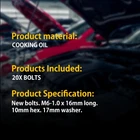 gtin13:Does not applyPackage included:20 x BoltsBrand:UnbrandedManufacturer Part Number:Does not applyNumber of Pieces:20Fitment Type:Direct ReplacementType:10mm hex. 17mm washer.Material:MetalColor:BlackQuantity:20 boltsUniversal Fitment:YesFeatures:Easy InstallationNew bolts:M6-1.0 x 16mm long. 10mm hex. 17mm washerUPC:Does not applyManufacturer Warranty:1 YearPlacement on Vehicle:Front, Left, Lower, Rear, Right, Upper