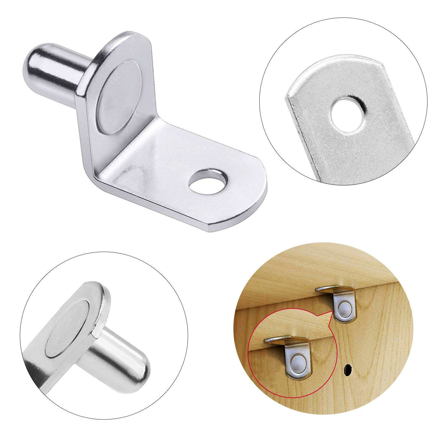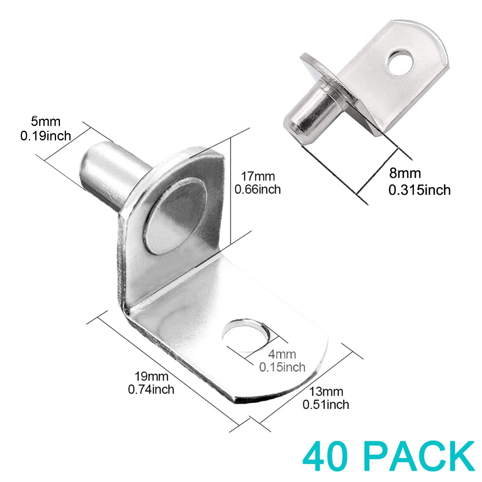 Shelf pegs for shelves,40 Pcs L-shape shelf pegs & pins are the right tool to provide support to your bookshelf,cabinet,furniture,closet,wardrobe,or other shelving units. Perfect fit for 5 mm/0.19 inch shelf holes,to hold up the heaviest of loads with ease and reliability. Specification: Material: Premium quality steel L-shaped bracket leg diameter: 5 mm/ 0.19 inch L-shaped bracket leg length: 8 mm/ 0.3 inch L-shaped bracket shelf rest length: 19mm/ 0.74 inch L-shaped bracket width: 13mm/0.51 inch Color: Silver IMPORTANT: Metal pins for shelves ONLY FIT 5 MM HOLE.Shelf peg leg length 8mm/0.3inch,Please make sure the thickness of the closet shelve will NOT LOWER than it. Feature: * Made of high quality steel, surface is smooth without burrs, will not easily rust and oxidized * These shelf support pins perfect fit for 5mm shelf holes on closet cabinets * Very easy to install by hand, can be widely used for cabinet, bookshelf, display cabinet, furniture, wardrobe, closet, cupboard, bookcase, pantry shelving Package included: 40 x L-shaped bracket supports Warning: small parts, keep away from children. Note: NOTE: For a tight fit,The bookshelf cabinet shelves hole should be equal to or slightly smaller than the 5 mm diameter shown. 【Size Detail】Shelf pegs for shelves fits all cabinets with 5 mm diameter holes.This set include 40 pcs L-shaped shelf holder pegs.L-shaped shelf peg leg diameter is 5 mm/0.19 inch,peg leg length is 8 mm/ 0.30 inch,and the shelf rest is 19 mm/ 0.74 inch in length, 13mm/ 0.5 inch in width.(IMPORTANT: Cabinet shelf pegs leg length 8mm/0.32inch,Please make sure the thickness of the cabinet will not lower than it.) 【More Safety Design】"L" shaped design engages the side of the shelf,forcing the pins to remain in the holes.Small hole allows the use of a screw to permanently secure the shelf.The unique design keeps the pin firmly seated in the cabinet holes, eliminating the chance of tear-out. 【Durable Material】Made of good quality steel,surface is smooth without burrs, will not easily rust and oxidized, Good quality and durable for long using life. 【Wide Applications】5 mm shelf support pegs install easily by hand,you can use them for cabinet, bookshelf, display cabinet, furniture, wardrobe, closet, cupboard, bookcase, pantry shelving, meet your daily needs.(Note: Adjustable cabinet shelf clips,Please keep these small parts away from child.) 【Warm Notice】In order to make cabinet shelf pegs a tight fit, your hole should be equal to or slightly smaller than the diameter shown. (Less than or equal to 5 mm / 0.19 inch)