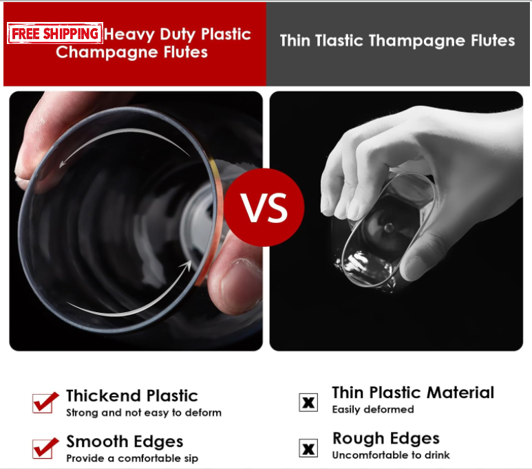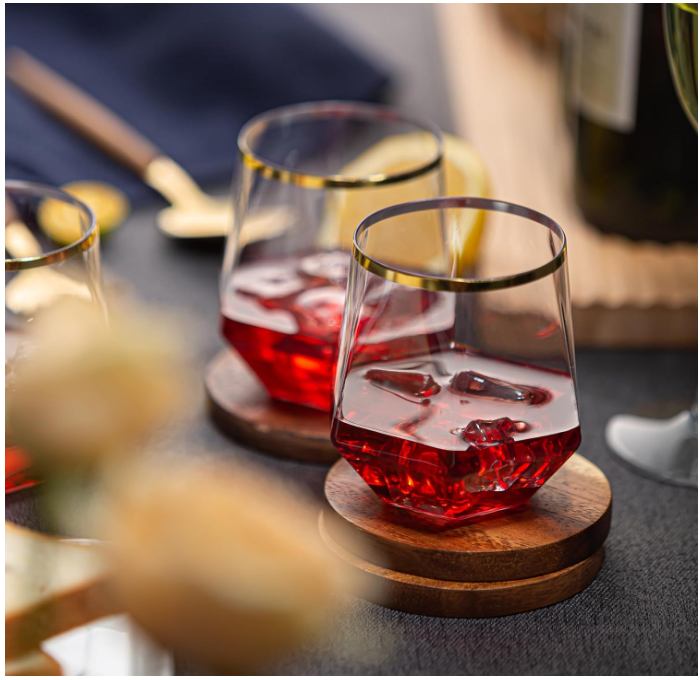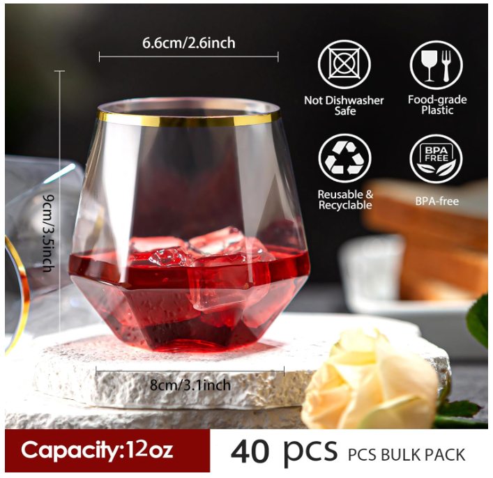 40 Pack Diamond Plastic Wine Glasses,Unbreakable Stemless Whiskey Cocktail Wine Champagne Glasses ABOUT THIS ITEM: This plastic wine glass features a unique diamond shaped and exquisite appearance. Gently rotating the body of the glass, it dances like a diamond in the air, which is very beautiful and can definitely add a touch of beauty to your exclusive party. Diamond Stemless Plastic Wine Glasses are made of premium plastic, durable, unbreakable, recyclable,BPA-free ensure a safe drinking experience.they are firm in your hand. Not dishwasher safe. Disposable Shatterproof Recyclable Gold Rim Glass is perfect for various indoor and outdoor activities, whether it's a lively party, casual gathering, or special celebration, our diamond plastic cup is the first choice. They can easily match any theme or decoration, and they shine at your party. This plastic wine glasses with gold rim set includes 40 12 ounce clear plastic wine glasses, perfect for holding various beverages, including cocktails, wine, champagne, Whiskey, and other cool drinks. Attention: The plastic stemless wine glass is made of high-quality PET plastic, which is healthy and harmless. Do not add hot water exceeding 60 degrees Celsius to the wine glass! Suitable for cold drinks! SHIPPING: We offer FREE shipping on all orders! We ship within Three business days of payment, usually sooner. We use a selection of shipping services such as UPS, FedEx, USPS etc. We only ship to the lower 48 states, no APO/FPO addresses or PO Boxes allowed. Local pickups and combined shipping options are not provided at this time. PAYMENT: We accept payment by any of the following methods: PayPal Please pay as soon as possible after winning an auction, as that will allow us to post your item to you sooner! FEEDBACK: Customer satisfaction is very important to us. If you have any problem with your order, please contact us and we will do our best to make you satisfied. Thank you for shopping with us!