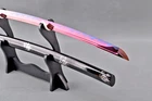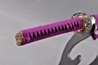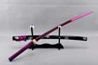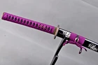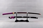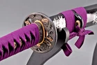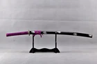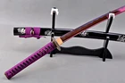 40''Purple Japanese Samurai Katana T10 Steel Battle Ready Sharp Functional Sword Product Parameter : Number: LQ160307 Swordsmith: 吉久正一 Package: 1sword+1bag It's a functional sword, after tests, professionals can cut bamboo, branch, paper or water bottles. Hamon: Yes Nakago: Full tang Bo-hi(blood groove): Yes Hardness(HRC): 58 Thickness: 0.7cm/ 0.28'' Width: 3.2cm/ 1.26'' Blade: 70cm/ 27.6'' Handle(tsuka): 26cm/ 10.24'' Overall: 103cm/ 40.6'' Material: T10 high carbon steel , elecroplating purple Fittings: Brass habaki&seppa+alloy fittings+ black genuine shark rayskin Crafts: Fully hand forged, traditional quench treatment, carefully hand-polishing,etc. About electroplating: Plating (Electroplating) is the use of electrolytic principle in some metal surface on a thin layer of other metal or alloy plating process, is the use of electrolytic action made of metal or other materials adhered on the surface of the parts of a layer of metal film technique to prevent metal oxidation (rust), improve the wear resistance and electric conductivity, reflective resistance, corrosion resistance, copper sulfate, etc.) and improve aesthetics, and so on. Note About us Sword Noun Explananation Delivery details Sword maintenance Note 1) We have already sent this item to the warehouse in America in advance. It's the lowest price we've ever had, and it's the lowest price on eBay . American customers can receive the packages 1-7 days after placing an order. 2) Because the item is already in the warehouse in the United States, we are sorry that we cannot add free carving service & replacement parts service for the moment. 3) We have free return service. If you don't like anything after you receive the package, we will bear the loss of return. Please feel free to buy. About us We have our own sword-casting factory. The factory is located in Longquan, a small town with a long history of sword-casting in China. Most of the famous Swords in China are made there. Rich raw materials, skilled technology, traditional sword casting technology from generation to generation. Manual production really takes a lot of time. We will prepare most products in advance,and arrange delivery within about a week. However, sometimes the delivery time is delayed due to weather or raw materials,etc. we hope to get your understanding. Feel free to contact us to inquire about the status of your order. Each handmade sword is unique. Our swords are great for gifts or for your own collection. Our swordsmithing master makes every sword attentively, hope you can feel our sincerity. We will also give you the best customer service, any questions please feel free to contact us. Sword Noun Explananation Quenching After the blade has been shaped, the sword would be quenched. We quench our swords in either water or oil. Water quenching produces a tougher edge which can also be hardened further more using clay. Blades quenched in oil are still considerably hardened and do have superior flexibility compared to a water quenched blade. Folded Steel: In the forging process , the most useful process is the folding, where the metals are forge welded, folded, and welded again, as many as 124 times(15 times is the best). The folding removes impurities and helps even out the carbon content, while the alternating layers combine hardness with ductility to greatly enhance the toughness. The less impurities, the harder and sharper the blade will be. We have done cutting tests on the blades. it can cut bamboo(young bamboo tree), grass mattings and slice paper(The blade should be tilted at 45 degrees). Clay tempered: To maximize both the cutting edge and the resilience of the sword spine, a technique of differential heat-treatment is used.The sword is painted with layers of clay before heating, providing a thin layer or none at all on the edge of the sword, ensuring quick cooling to maximize the hardening for the edge.A thicker layer of clay is applied to the rest of the blade,causing slower cooling.This creates softer,more resilient steel, allowing the blade to absorb shock without breaking. About 1095 carbon steel: The best quality of high carbon steel is at 1095, the carbon content was 1.03%, and the element contains a small amount of chromium, molybdenum, vanadium, after heat treatment can reach HRc58-60 hardness, toughness is very good, but not resistant to rust, more be applied to traditional european-style hunting knife, large cutting knife and military dao. Such as the United States during world war ii "KA - BAR" saber is in 1095 as the blade material. Kobuse: The vast majority of modern katana and wakizashi are the maru type which is the most basic, with the entire sword being composed of a single steel. The kobuse type is made using two steels, which are called hagane (edge steel) and shingane (core steel). Steel of different materials is forged and welded together to hammer the basic shape of the sword. This allows the overall blade to have a higher toughness and absorb a lot of impact. Reducing the possibility of breaking or bending to some extent. Makes the blade not only has high hardness, but also has super toughness Delivery details a) If you do not receive the package, or the package is damaged during transportation. We'll take care of it. Please feel free to buy. b) If it is mentioned in the product description that the package includes the sword bag or sword holder, the style will be random. The sword holder or sword bag on the ebay picture is the props we use for shooting. If you really like a style, please contact us before buying. c) If you have any problem after recieve the package (wrong size, wrong style, etc.). We always provide you with the best after-sales service. Please give us a chance to help you before you give us a bad feedback . Thank you very much! Sword maintenance