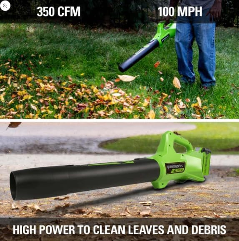 40V COMBO KIT – This string trimmer / blower combo kit allows you to keep your walkways and driveway clear of overgrown grass and weeds, enhancing your curb appeal 13” TRIMMER / EDGER (2-IN-1) – Converts from trimmer to edger with push of a button. Trimmer head rotates 90° so you can trim and edge at multiple angles, and the durable aluminum telescoping shaft adjusts to user’s height and posture EASY TO USE / AUTO FEED LINE – Push button start / .065” single line auto feed head LEAF BLOWER – Provides powerful clearing performance featuring 350 CFM air flow and 100 MPH air speed LIGHTWEIGHT – Ultra lightweight design, along with superior ergonomics allow for reduced user fatigue The Greenworks 40V lithium-ion platform powers over 60 outdoor products, including lawn mowers, blowers, string trimmers, chainsaws, hedge trimmers, and much more! The 40V lithium-ion battery provides the power you need, and delievers fade-free power with no memory loss after charging. The outdoor power equipment allows you to tackle up to 1/2 acre with the available 2Ah, 2.5Ah, 3Ah, 4Ah, 5Ah, and 6Ah batteries. USB ports are integrated into the BAF701, BAF702, L-300, BAF704, BAF705, L-600 batteries, making it a portable charger for phones, tablets, and other compatible electronic accessories. The Greenworks 40V platform comes with a 3 year tool / battery warranty to protect your investment.