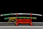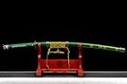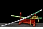 Product Parameter: ITEM NUMBER: TYQ114 OVERALL LENGTH: 103cm/40.6'' BLADE LENGTH: 70cm/27.6'' TSUKA LENGTH: 26cm/10.24'' BLADE WIDTH: 3.2cm/1.26'' BLADE THICKNESS: 0.7cm/0.28'' BLADE HRC(hardness): 58 BLADE CRAFT: Fully hand forged, water quenching,hand-polishing etc. BLADE MATERIAL: T10 high carbon steel BLADE SHAPE: Shinogidukuri NAKAGO: Full-tang (2 meguki fix the handle vertically, very firm) KISSAKI: medium (chūkissaki) BO-HI(blood groove): No bo-hi TSUKA(HANDLE): Hard wood core, hineri maki SAMEGAWA: White TSUBA/FUCHI/KASHIRA/MENUKI: Alloy, sakura design SEPPA/HABAKI: Brass SAYA: Shinny lacquered wooden scabbard with golden flower pattern SAGEO: Green&yellow Japanese thick Synthetic silk wrapping cord The steel we use is not the normal steel with the truck or cars or other life electrics, the steel use for the blade contents much more carbon and the purity can not be comparable. * It's a functinonal sword. After test, it can cut bamboo, A4 paper and water bottles,etc . * The sword stand is not include. Package include 1 sword + 1 random bag . Manual grinding: Using the unique bright stone of Longquan Town, hand grinding, very test sword casting skills and technology, grinding out the pattern effect is special texture! Ancient quenching: Modern vacuum heat treatment can meet the hardness requirements of most swords, but the traditional quenching method has better effect, can soften the medium strip steel, and the hardness is higher. Additional Service About us Sword Noun Explananation Delivery details Sword maintenance Additional Service It's free for engraving English words, Chinese Characters and Japanese Kanji , etc. You need pay extral $20-30 for engraving patterns. Sharpness Most of our blades are sharp. We can also make the blade unsharpened for free if you require. Matching Swords Set If you buy one katana, we can make a matching Wakizashi or Tanto for you. The price varies from different swords. Please contact us if you need make custom matching set. About us We have our own sword-casting factory. The factory is located in Longquan, a small town with a long history of sword-casting in China. Most of the famous Swords in China are made there. Rich raw materials, skilled technology, traditional sword casting technology from generation to generation. Manual production really takes a lot of time. We will prepare most products in advance ,and arrange delivery within about a week. However, sometimes the delivery time is delayed due to weather or raw materials,etc. we hope to get your understanding. Feel free to contact us to inquire about the status of your order. Each handmade sword is unique. Our swords are great for gifts or for your own collection. Our swordsmithing master makes every sword attentively, hope you can feel our sincerity. We will also give you the best customer service, any questions please feel free to contact us. Sword Noun Explananation Quenching After the blade has been shaped, the sword would be quenched. We quench our swords in either water or oil. Water quenching produces a tougher edge which can also be hardened further more using clay. Blades quenched in oil are still considerably hardened and do have superior flexibility compared to a water quenched blade. Folded Steel : In the forging process , the most useful process is the folding, where the metals are forge welded, folded, and welded again, as many as 124 times(15 times is the best). The folding removes impurities and helps even out the carbon content, while the alternating layers combine hardness with ductility to greatly enhance the toughness. The less impurities, the harder and sharper the blade will be. We have done cutting tests on the blades. it can cut bamboo(young bamboo tree), grass mattings and slice paper(The blade should be tilted at 45 degrees). Clay tempered : To maximize both the cutting edge and the resilience of the sword spine, a technique of differential heat-treatment is used.The sword is painted with layers of clay before heating, providing a thin layer or none at all on the edge of the sword, ensuring quick cooling to maximize the hardening for the edge.A thicker layer of clay is applied to the rest of the blade,causing slower cooling.This creates softer,more resilient steel, allowing the blade to absorb shock without breaking. About 1095 carbon steel : The best quality of high carbon steel is at 1095, the carbon content was 1.03%, and the element contains a small amount of chromium, molybdenum, vanadium, after heat treatment can reach HRc58-60 hardness, toughness is very good, but not resistant to rust, more be applied to traditional european-style hunting knife, large cutting knife and military dao. Such as the United States during world war ii "KA - BAR" saber is in 1095 as the blade material. Kobuse : The vast majority of modern katana and wakizashi are the maru type which is the most basic, with the entire sword being composed of a single steel. The kobuse type is made using two steels, which are called hagane (edge steel) and shingane (core steel). Steel of different materials is forged and welded together to hammer the basic shape of the sword. This allows the overall blade to have a higher toughness and absorb a lot of impact. Reducing the possibility of breaking or bending to some extent. Makes the blade not only has high hardness, but also has super toughness Delivery details a) Import duties, taxes and charges are not included in the item price or shipping charges . These charges are the buyer’s responsibility. b) If you do not receive the package, or the package is damaged during transportation. We'll take care of it. Please feel free to buy. c) If it is mentioned in the product description that the package includes the sword bag or sword holder , the style will be random. The sword holder or sword bag on the ebay picture is the props we use for shooting. If you really like a style, please contact us before buying. d) If you have any problem after recieve the pac