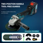 cordless small angle grinder is designed to enhance performance and productivity, making it an essential tool for various grinding and cutting tasks. The cordless design offers great convenience, allowing you to use the grinder both indoors and outdoors without the hassle of tangled cables. It features a universal 7/8" arbor, making it compatible with a wide range of accessories.Additionally, the anti-vibration side handle ensures increased user comfort and safety. nhanced Performance: Capable of reaching speeds up to 9000 RPM, this brushless angle grinder excels in grinding, metal cutting/sharpening, and rust removal on various surfaces including metal, wood, and concrete. With its four-speed settings, the angle grinder offers precise control and versatility for a wide range of applications, striking an ideal balance between power and precision Convenient Cordless Design: Whether utilized indoors or outdoors, the portable design of this cordless angle grinder ensures exceptional convenience. Experience efficient grinding with the added benefit of wireless operation Versatile and User-Friendly: Our 5" grinder tool features a universal 7/8" arbor, making it compatible with a wide range of accessories. Electric clutch for kickback protection. Ergonomic handle can be mounted on both sides of it. Providing safety and comfort to the process of using