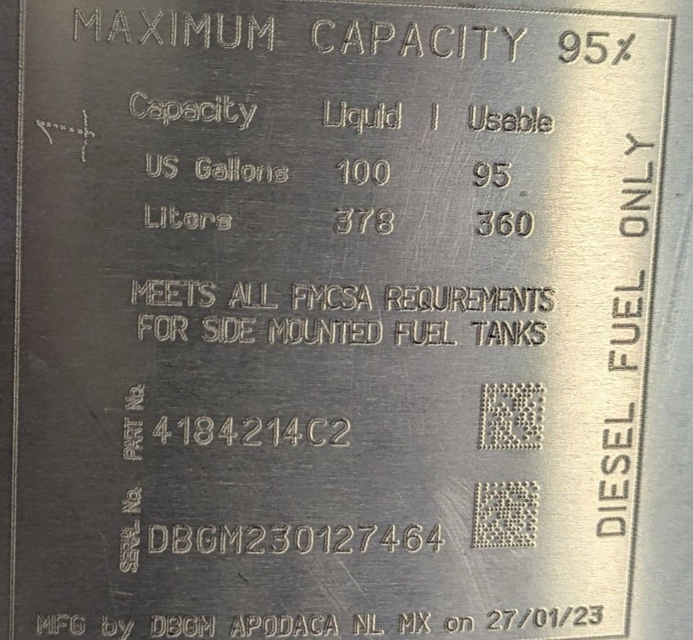 4184214C2 International Diesel Fuel Tank 26 X 47 inch 100 Gal. Right Hand Fits LT LS and RH model trucks. This is a non polished new takeoff tank. It had fuel in it which has been drained and tanks are clean & dry. Some handling scuffs and small dings from bracket point when mounted see photos. All measurements in the photos start from the end closest to the fill. Being this is a right hand tank that would mean the rear of the truck. End of tank to center of fuel fill 18.5 inches End of tank to first fuel draw / return 20 inches End of tank to second fuel draw return 32 Inches End of tank to Vent hole and tube strap 29 1/2 Free Shipping These tanks ship via LTL Truck I will stand them in wood crates and protect the top with cardboard. Free shipping requires a business address to ship to. Liftgate drop residential is available for an additional $75 Free freight applies to the lower 48 contiguous states only.