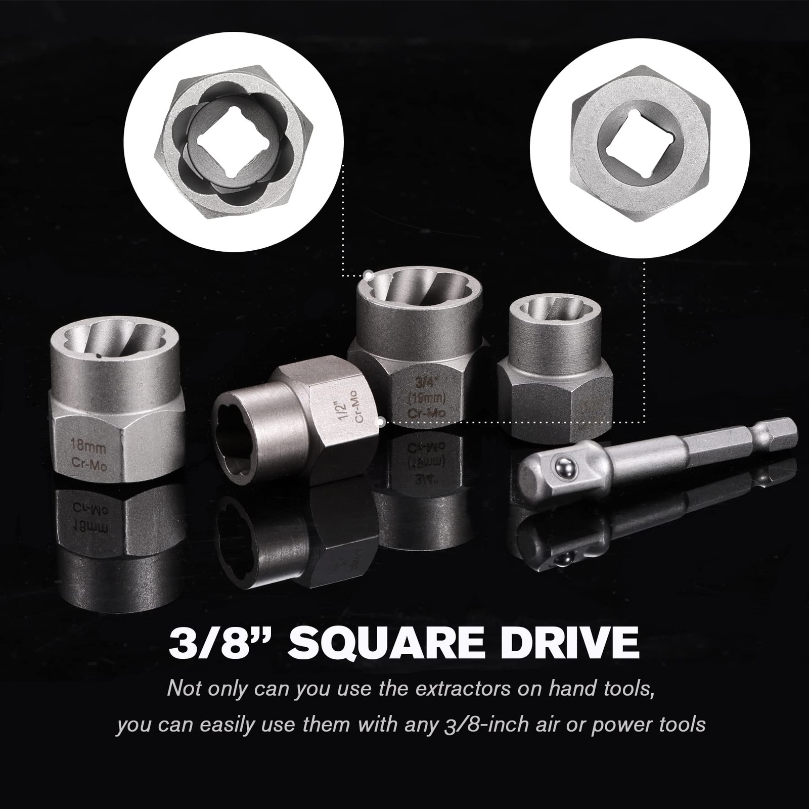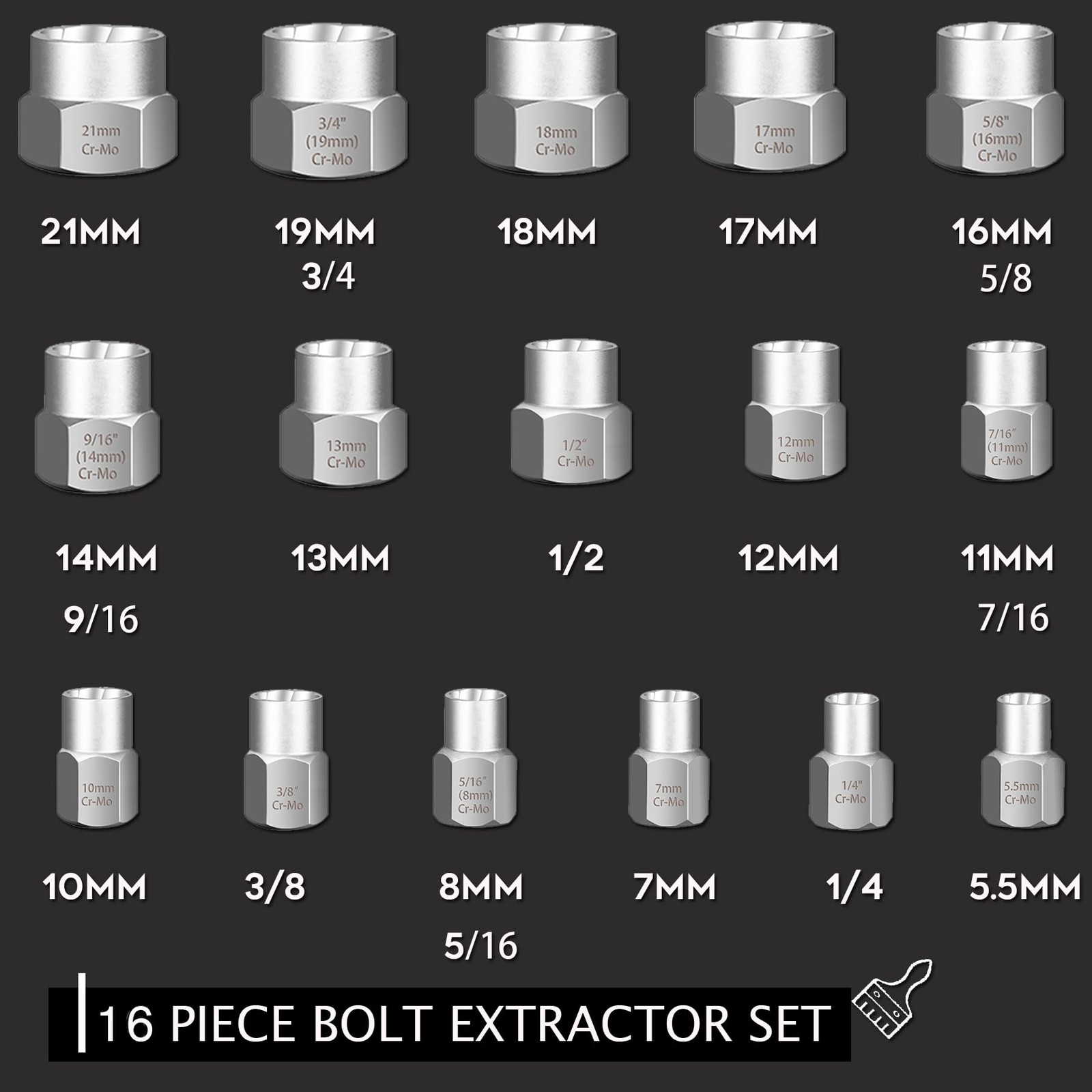 41-Piece Bolt Extractor Screw Extractor Set and Stripped Screw Remover 41 Piece Screw & Nut Remover Kit- Including 10-piece spiral screw extractors: 1#, 2#, 3#, 4#, 5#, 6#, 7#, 8#, 9#, 10#, 10-pieces HSS drill bits:Ex#1, Ex#2, Ex#3, Ex#4, Ex#5, Ex#6, Ex#7, Ex#8,Ex#9, Ex#10 and 13-piece bolt nut remover set: 21mm, 19mm(3/4") , 18mm, 17mm, 5/8" ( 16 mm ), 9/16" ( 14mm ), 13mm, 1/2", 12mm, 7/16" ( 11mm ), 10mm, 3/8", 5/16" ( 8mm), 7mm, 1/4" and 4-piece adapter. Solid Carrying Case for Storage - 41 pieces tools are all packed in a rugged, compact carry case for storage and portability. Each tool fits snugly into its respective place to prevent moving around and scraping. Easy to use:Suitable for both power tools and hand tools,high density spiral design helps faster removing broken screws, bolts, nuts, studs, fittings, threaded pipes and pins. Clear lettering-the size is engraved on the socket for easy identification,chamfered bit ensures a smooth fit onto fasteners. Whether it's for car maintenance or daily use, it can provide you with great convenience.