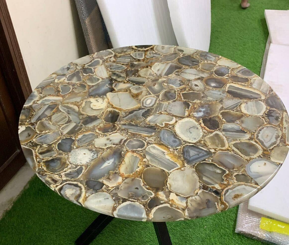 Note :- Customs duties and other duties levies in destination country are responsibility of the customer. Note:- Base / Stand is not included with the table top. This piece of art is an example of Handmade Craftsmanship done with a lot of effort and patience. It is made from Agate Stone. It is a perfect gift for your loved ones as it is made with extreme care and love. The Table Top will definitely make your room beautiful. It could be used for Eating, Drinking Purpose It could be used indoor and outdoor and will definitely be a piece of conversation. About AGATE: Agate is a translucent variety of microcrystalline quartz. It is used as a semiprecious stone when it is of desirable quality and color. Agate generally forms by the deposition of silica from groundwater in the cavities of igneous rocks. The agate deposits in concentric layers around the walls of the cavity, or in horizontal layers building up from the bottom of the cavity. These structures produce the banded patterns that are characteristic of many agates. Some of these cavities are lined with crystals and those are known as geodes. Agate occurs in a wide range of colors, which include brown, white, red, gray, pink, black, and yellow. The colors are caused by impurities and occur as alternating bands within the agate. The different colors were produced as groundwater of different compositions seeped into the cavity. The banding within a cavity is a record of water chemistry change.