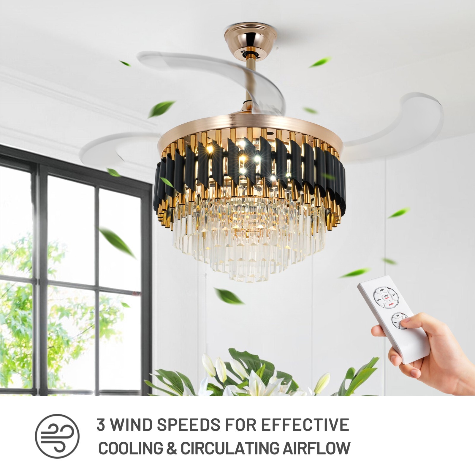 42" Gold Luxury Invisible Ceiling Fan Crystal Chandelier Remote 3-Color 3-Speed 42" Luxury Crystal Ceiling Fan with Light Chandelier Remote Control Retractable Fandelier, 3 Color Lighting Silent Fixtures SPECIFICATIONS: Type: Modern Fan Chandelier Style: Modern Crystal Luxury Color: Black+ French gold Material: K9 Crystal shade; High quality acrylic blades; plating metal Light source: 36W LED stripe Is it reversible: Not reversible Remote control: 3 fan speed(low/medium/high); 3 light color(cool light, warm light, yellow light ); Timing function:1/2/4/8 hours Muted Motor: 30dB, high-quality silicon steel sheet material, insulation, rust treatment, energy-saving. Applicable place:10㎡-25㎡,Perfect for decorating your kitchen,bedroom,living room, dinging room,cafe,restaurant,hotel,office,etc DETAILED FEATURES RECOMMENDATION: It's suitable for installation in your bedroom, living room, lobby, kitchen, restaurant, bars, shops, cafes, salons etc.. Room size:10-25 Square meter Please note if the 5" bracket is larger than your electric box, please just drill 2 closer holes on the bracket to fit your ceiling box, which is very easy. FEATURES Modern Luxury Crystal Design Ceiling Fan and Light in 1 Chandelier Retractable& Invisible Blades 30dB Silent but Powerful Fan Working Remote Controls 3-Speed, 3-LED Color and Timer CHANDELIER Fan and light in 1 chandelier, bringing cools and lighting the room at the same time. The light and fan can be turned on/off individually via the remote control to suit your different needs. Details: REMOTE CONTROL: 3 Light colors: Cool, Neutral, Warm 3 Fan speeds: Low - Mid - High Timer function: 1/2/4/8H automatic off Wall switch is compatible. Can't install wall dimmer switch and remote at same time. DIMENSIONS: Diameter: 42Inch(blades open) Lampshade diameter :19inch Height: 19in(With short rod); 23in(with long rod) DownRod: 4in/8in Replacement could provide if there is any damage or defective 3 COLORS: Cool Light: 6000K Neutral Light: 4500K Warm Light: 3000K CFM 150-180 cubic meters per minute K9 Crystals and Metal Frame Shade INSTALLATION TIP: Ceiling loading is preferably greater than 30KG, Ceiling height is preferably greater than 110" Please check the dimensions before ordering, just to check it is suitable for your room. Installation video is available in listing, professional installation would be recommended. Please note the bracket size is 5",if it's larger than your electric box, please just drill 2 closer holes on the bracket to fit your ceiling box, which is very easy Fan and light in 1 chandelier, bringing cools and lighting the room at the same time,saves your room space and be a good-looking chandelier. Payment Delivery details Return Contact us About us Payment 1.We accept PayPal,G Pay Credit Card,Visa ,etc. payment. 2. Please make payment within 4 days after placing an order, or eBay will automatically open an unpaid case on the fourth day. 3. You can contact us for sure if you want to cancel the order to avoid the unpaid case. Delivery details Your goods will be shipped within our handling time after your full payment. Pls note that we don't ship to Alaska, Hawaii and Puerto Rico.APO/FPO’s address. Return We accept return within 30 days, but we are not responsible for human damage.The return shipping cost is the buyer's responsibilities and try to keep it in your original package. Contact us If you have any questions please contact us through "Ask seller a question" link. We will respond within 2 business day or less. About us We are committed to providing you with a comfortable home and by functional and beautiful ceiling fans and lighting fixtures. As a professional modern lighiting fixture supplier, our team has more than 15 years Ceiling fan and lighting production experience. We are not only committed to produce high-tech, stylish, safe and high quality LED products, but also provide our professional and efficient after-sales service, making your lighting experience more pleasant and comfortable.