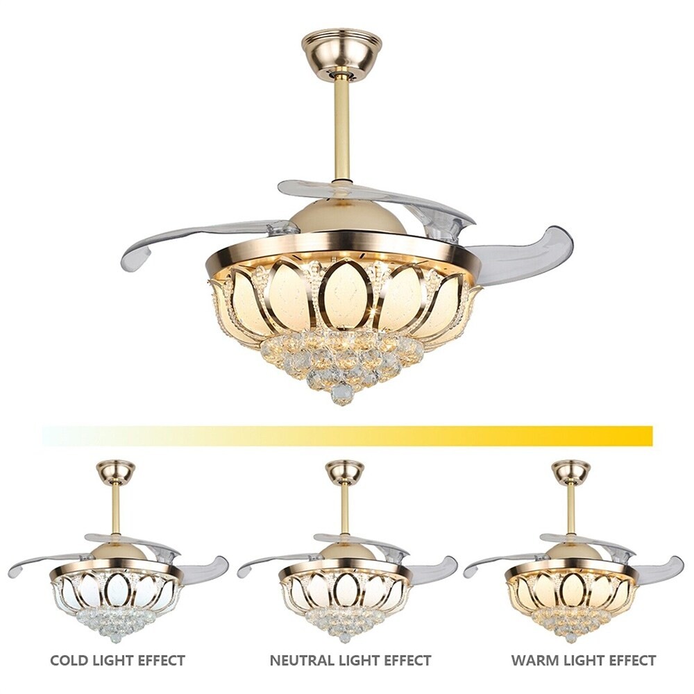 DescriptionCrystal LED Ceiling Fan with Light and Remote Control, 4 Retractable Blades, 3 Colour Changes, Ceiling Light with Timer, Quiet for Living RoomFeatureRemote ControlIntegrating turn on light with 3 color changes (white, warm white, neutral white)you can use the remote control to choose the color you like.Crystal desige the 3-layer body is all decorated with K9 crystal and absolutely stunning when the light is on. Light effect makes your room full of luxury.Ceiling FanWith ABS blades, It can be used as an electric fan, and it can also be used for lightingApplicationsIdeal for living room, dining room, foyer, villa, bedroom, restaurant, study room, and other places to decorate lighting fixtures.Customer ServiceIf you have any issues, inquiries or need assistance, please feel free to Free Shipping Over $49.99* Details 42" LED Modern Ceiling Fan Light Crystal Chandelier Lamp W/ Remote - 26.37" x Product Description: DescriptionCrystal LED Ceiling Fan with Light and Remote Control, 4 Retractable Blades, 3 Colour Changes, Ceiling Light with Timer, Quiet for Living RoomFeatureRemote ControlIntegrating turn on light with 3 color changes (white, warm white, neutral white)you can use the remote control to choose the color you like.Crystal desige the 3-layer body is all decorated with K9 crystal and absolutely stunning when the light is on. Light effect makes your room full of luxury.Ceiling FanWith ABS blades, It can be used as an electric fan, and it can also be used for lightingApplicationsIdeal for living room, dining room, foyer, villa, bedroom, restaurant, study room, and other places to decorate lighting fixtures.Customer ServiceIf you have any issues, inquiries or need assistance, please feel free to contact us, we will try our best to help you.specificationStyleModernTypeCeiling Fan ChandelierLight SourceLed Lighting Board(Include)Switchremote control3 fan speed1-3Light color:3 regular colors change by remoteTiming function:1/3/6 hoursVoltage:110V Wattage:36wApplications:8-25Living Room, Ding Room,Bedroom, Study Room, Corridors, Foyer, Kitchen, Restaurant, bar, coffee shops etc Dimension:Diameter:42in /107cm(blades open)Long Downrod Length9.8" (25 cm)Short Downrod Length3.9" (10 cm)Total Height20.4" (52cm)/ 26.3" (67cm)You can choose a suitable rod length according to your needsLampshade:glass+crystalBladesAcrylicElectronic materialsSteel+ copper wireMaterialHigh quality Acrylic lampshade, Plating metal Warm Tips:This fan needs basic assembly, professional would be highly recommended.Floor height is greater than 110", ceiling load is greater than 25kg.