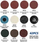 42 PCS 2 in Roll Lock Sanding Disc Set 1/4 Holder Die Grinder Quick Change Discs Features *20 x Aluminum Oxide Abrasive Twist Lock Sanding Discs ( 5pcs each of grit 36/60/80/120 ): The unique 2-Layer Blue Polyester Lining Cloth enhances disc strength and reduces friction between sanding disc and rubber pad holder, to resist disc coming loose when operating which helps achieving longer lifespan and ensuring security. Chosen sharp aluminum oxide abrasive which provides increased life, fast cut rate, consistent finish. Ideal for blending, deburring, edge beveling, flat areas, grinding, prepping metal prior to paint, weld removal on steels, soft metals such as aluminum, hard woods, soft woods *15 x Non-Woven Surface Conditioning Discs ( 5pcs each of grit coarse/medium/fine ): Non-woven material delivers predictably, consistent, uniform Finish. Ideal for surface prep, removing paint, rust, oxides, corrosion, scale, deburring, blending, cleaning, finishing, polishing on stainless steel, alloys, non-ferrous materials, plastics, and fiberglass. *2 x Black Poly Strip Discs: Benefit from high hardness silicon carbide mineral and extra coarse grain, the stripping discs achieves sharp to cuts fast to save your time. Used for removal of paint, wood, weld lines and weld splatter, scaling and oxidation, glue and other adhesives, surface preparation in auto body shops *2 x Zirconia Flap Discs ( 1pc each of grit 36/80): Premium imported zirconia abrasive fractures frequently to continually produce fresh sharp points and deliver a faster cut-rate. Developed for heavy stock removal.For blending, beveling, deburring on any carbon or mild steel flat surfaces, stock removal in tight places *2 x Wool Polishing Discs: Dense fine wool material. Perfect for polishing your work piece to make it achieve smooth surface or using with wax, polish or paste to remove light scratches in object *1 x Disc Holder: 1/4" steel shank, fits air angle die Grinder, air straight die grinder, power drills, rotary tools, and other power tools *High Strength Plastic R Type Twist Lock Attachment: Offers quick and easy disc change-out for multi-step finishing processes Specifications Item Name: 42PCS 2 inch Roll Lock Sanding Disc Set Color: Red/Maroon, Blue, Yellow/Brown, Black, White Abrasive Material: Aluminum Oxide, Non-Woven, Silicon Carbide, Fine Wool Backing Material: Polyester Cloth, High Strength Plastic Bonding Material: Cured Adhesive Resins, Resin Over Resin Disc Type: Quick Change Disc, R Type Twist Lock Sanding Disc Disc Dia.: 2 inch Shank Dia: 1/4 inch, 6.35mm MAX RPM: 25,000 Recom. RPM: 3800-5000RPM Package Included 5 x A/O Roll Lock Sanding Discs 36 Grit 5 x A/O Roll Lock Sanding Discs 60 Grit 5 x A/O Roll Lock Sanding Discs 80 Grit 5 x A/O Roll Lock Sanding Discs 120 Grit 5 x Surface Conditioning Discs Coarse Grit - Brown 5 x Surface Conditioning Discs Medium Grit - Maroon 5 x Surface Conditioning Discs Fine Grit - Blue 1 x Zirconia Flap Disc 36 Grit 1 x Zirconia Flap Disc 80 Grit 2 x Black Poly Strip Discs 2 x Wool Discs 1 x Disc Holder 42 pieces in total