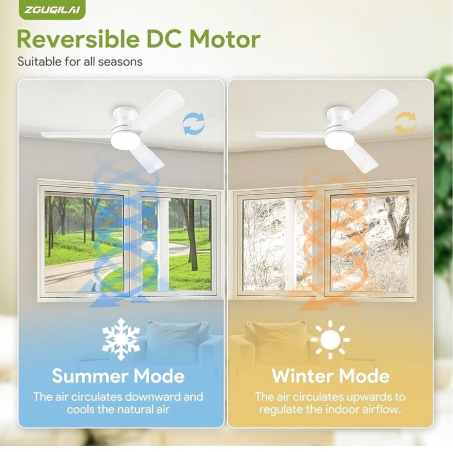42 Inch Ceiling Fans with Lights】The ZOUQILAI bedroom ceiling fan features a stylish retro design and reversible blades, making it a perfect match for white ceiling fan with light setups, including family and modern interiors. As a flush mount ceiling fan with light, it is ideal for spaces ranging from 10 ft x 10 ft to 15 ft x 15 ft and suitable for indoor areas such as bedroom, living rooms, kitchens, and offices.