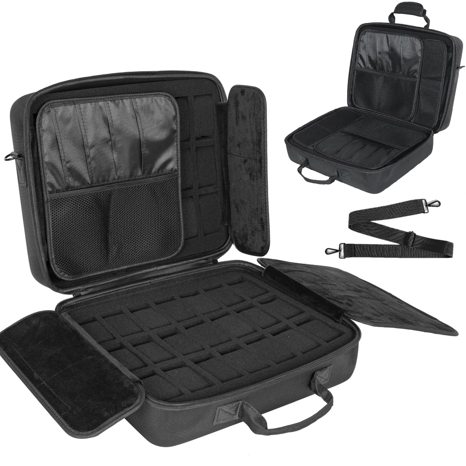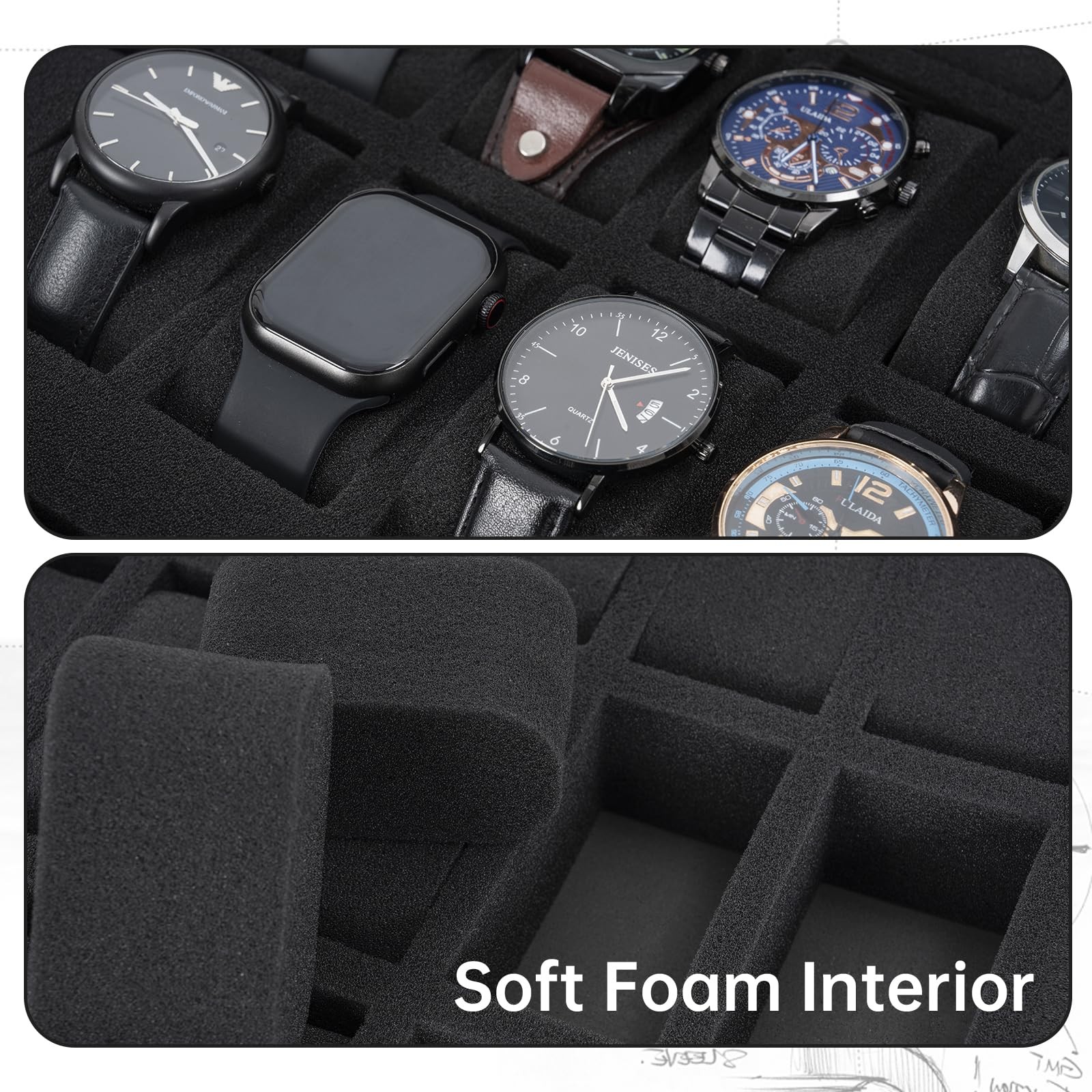[Watch Case Can Hold] hard-shell watch box can hold 42 watches on a soft polyurethane foam pillow, providing effective protection without scratching your watch or stretching your watch strap, and can accommodate men's and women's watches/small items/watch straps of different sizes [Partition Features] suitcase adopts a regional design, the upper and lower modules can be removed, and the middle kesla partition is used as a protective design to prevent you from accidentally scratching the dial during movement. You can see all watches when you open the case [Shock-absorbing Foam] Pre-cut foam, easily store your watches and other collections. Not only protect your watches, but also keep your items organized for easy storage and travel. Perfectly cut custom foam can be placed in your watch, bracelet, accessories collection [Right Decision] If you really need to protect your watch, choose watch case! ! ! Unlike other fragile display boxes on the market, you can have a practical and advanced hard-shell watch box. (This product is only a suitcase with customized foam) [Quality Service] is committed to satisfying you. If this watch travel box does not meet your expectations, please feel free to contact us. I will provide a satisfactory answer and solve the problem actively and promptly