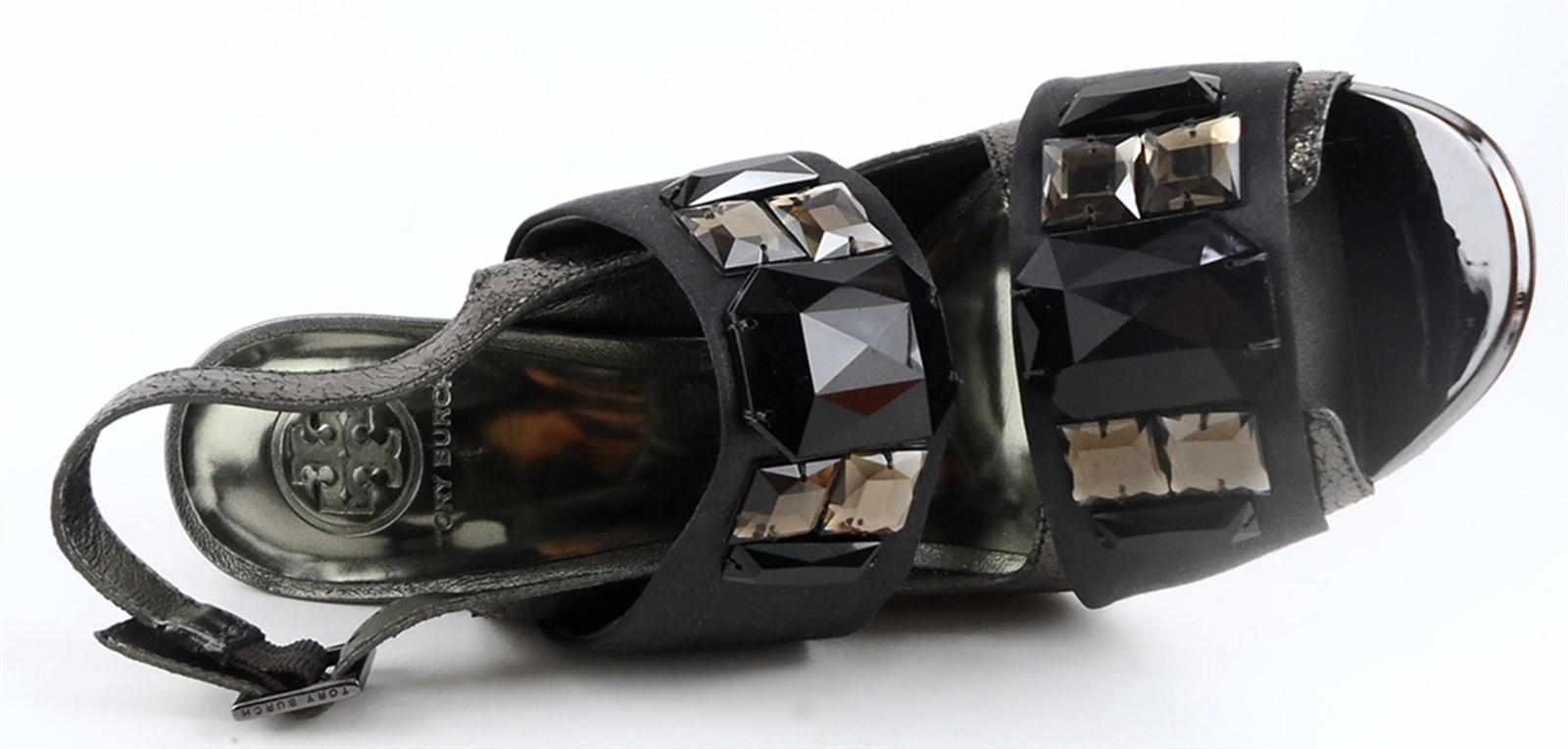 New/ store display ( outsole sightly scuffed on right shoe ) in original box (no lid ) Satin/ metallic leather upper; Leather lining; Leather sole Covered heel measures 5" * Rhinestones on straps Open toe design Adjustable ankle strap with steel tone buckle *Measurements are hand taken for every item we sell. Every item is carefully inspected to ensure that you receive a quality product. Designer Shoe Box guarantees this product is 100% Authentic