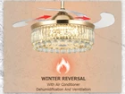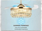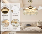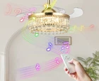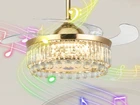 42" Crystal Bluetooth LED 7-Color Chandelier Music Play Ceiling Fans with Light SPECIFICATION The fan is 42 inches (107 cm) in diameter, weighs 13 kg, and measures 18.9 inches (48 cm) with the blades closed. 2 metal booms are included in the package, 4" (10cm) / 7.8" (20cm) lower rods are optional. FEATURES REMOTE CONTROL: The fan uses a remote control, which can be easily controlled APP CONTROL:adjustable lighting and playback speakers, more functions are waiting for you to discover. 6 FAN SPEEDS: from low to high, can be adjusted according to the situation ROTATION DIRECTION: two-way rotation, can be forward and reverse, cool and ventilated in summer, reverse air circulation in winter, multiple choices, you deserve it! LIGHTING: 3 light colors for daily life: cool, neutral, warm (3000-6000K), 7 colors are adjustable, ready for a party, your friends will envy you! TIMING FUNCTION: 1/2/4/8H automatic shutdown, no longer afraid of forgetting to turn off the fan and causing waste This ceiling fan is newly upgraded 3-in-1, combining a smart speaker, invisible ceiling fan and crystal chandelier. The sturdy and durable metal lampshade is fully decorated with A-grade K9 crystal tubes, and the raindrop crystal ball hangs at the bottom of the lamp, which is absolutely stunning when the lamp is turned on, making your room comfortable and luxurious! APPLICATION It is suitable for installation in your bedroom, living room, lobby, kitchen, restaurant, bar, shop, cafe, salon, etc. ROOM SIZE: 10-25 square meters WARRANTY Warranty against manufacturing defects and unsatisfactory replacements. Damaged parts are replaced free of charge. If the package you received has any damage or missing accessories, please feel free to contact us via Amazon message, we will help you solve the problem and provide satisfactory service