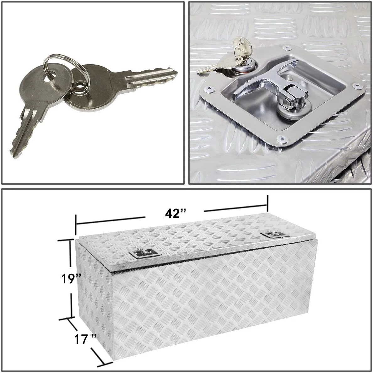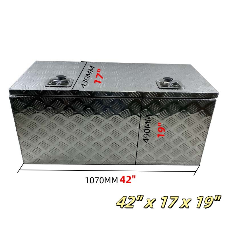 Specifications: 1. Material: Aluminum 2. Product Dimensions: 42" x 17 x 19" 3 . Position: Truck Bed, Underbody 4 . Color: Silver FEATURES: 1. This tool box is designed to save space and provide extra storage by conveniently mounts under your vehicle 2. Perfect for tools storage in your vehicle or in your garage/home 3. Portable case, lightweight for easy carrying 4. Perfect as an all-purpose storage, this item is a must have for families 5. Equipped with keys for locking Package Includes: 1 x Aluminum Tool Box Lock Keys SHIPPING : DOMESTIC LOWER 48 US STATES: FREE VERY IMPORTANT: Double check shipping address. We are not responsible for incorrect or undeliverable addresses. Product will be shipped within 1 business days after full payment is received and verified. Delivery Time is about 3-7 business days to most of countries. We ship the package to your shipping address in eBay instead of the one in PayPal. Please tell us your shipping address if it is different from the one in eBay. The tracking number will be given for the customer to check the shipping status online (registered or faster service only). We are not responsible for any wrong or undeliverable addresses. Please verify and update your shipping address on eBay during checkout. PAYMENT : Item will be shipped out within 24 hours after payment cleared, except for weekends and holidays. RETURN : 30 Days Free Returns, please notify us within 30 days after you've received your order. Please email us or call us to obtain a RMA (Return Merchandise Authorization) number from us, and have the RMA number written on the return package. Items to be returned must be in resalable condition. All returns are for refund ONLY. No exchange accepted. TERM & CONDITION : For emissions related items, please check with your local jurisdiction for emission specific requirements before purchasing. All items do not come with installation instruction unless otherwise specified. If item is questionable, please consult your local professional/mechanic before making purchase. Please leave us POSITIVE FEEDBACK and 5 stars DSR if you are happy with the transaction.