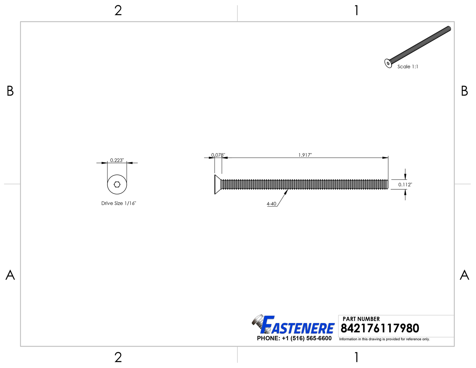 4-40 x 2" Flat Head Socket Cap Screws Allen Drive Stainless Steel Qty 1000 The stainless steel socket cap screw has a plain finish and a flat head with an internal hex drive. Stainless steel resists corrosion and may be magnetic. The flat head is cone shaped for use in countersunk holes and has a flat top that fits flush with the mated surface. The internal hex drive, also known as a hex-socket drive, has a hexagonal slot that requires an Allen key driver, also known as a hex key or Allen wrench. Socket cap screws are threaded fasteners that have a cap head with an internal socket drive for installing in areas with limited side clearance. These screws are available with a variety of head shapes, which determine how the screw interacts with the mating surface, and drive styles, which determine the type of tool required to install the screw. General Product Information Head Style : Flat Drive Style : Allen Hex Key Drive Size : 1/16" Thread : 4-40 Overall Length : 2" Quantity of Fasteners in Package : 1000 Detailed Product Information: Head Diameter : Head Height : 0.078" Countersink Angle : 82 Degree Thread Diameter : 0.112" Threads Per Inch (TPI) : 40 Coarse or Fine Thread : Coarse Thread Coverage : Full Thread Thread Length : 1.917 Key Notes: Flat head socket cap screws have a internal hex drive that can be driven with an allen key or hex bit and a machine thread that will match up to any internally threaded item with the same machined thread patern which is apart of the unified thread system Flat head screws have a flat top that tapers down to a cone shape that will sit flush into a countersunk hole and give a finished appearance 82 degree flat head is the most common countersunk screw head angle These flat socket cap screws are made of a high quality 18-8 grade stainless steel that offers a great corrosion and chemical resistance that will stand strong against the elements. Flat head countersunk machine screws length are measured from the top of the flat head to the end of the thread and the thread length is the overall length minus the height of the head Shipping: All orders placed before 3:30 pm EST Will Ship Same Day Tracking is provided on ALL Orders Priority Mail Shipping service is offered at a discount of only $3.95 UPS Ground UPS Next Day Air is available, Please inquire for pricing Returns : ALL returns are accepted if returned within 60 days. Money Back or exchange guaranteed. NO Restocking Fees. For YOU, we constantly strive to find ways of improving our performance.